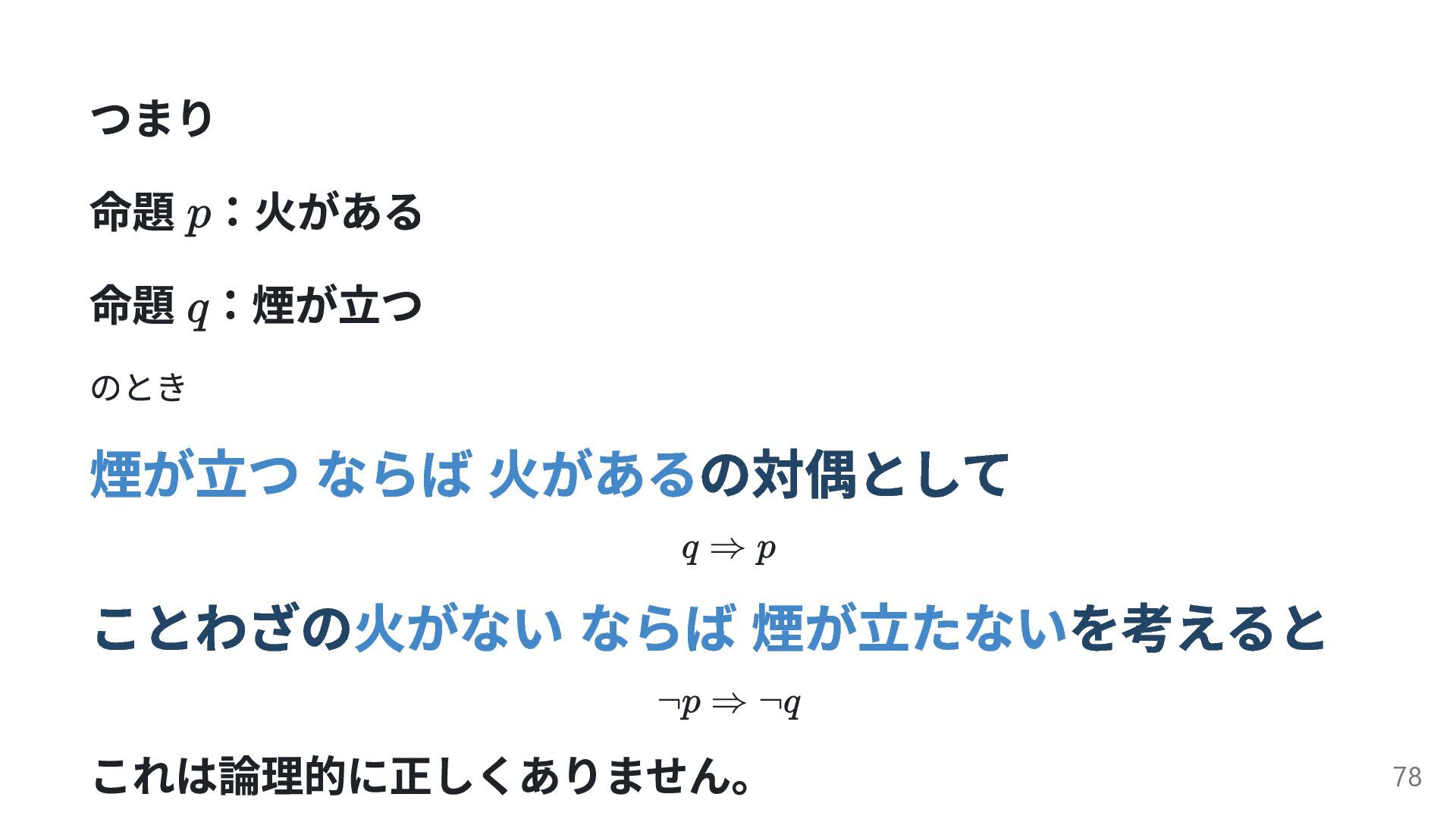 ならば 煙が立たないを考えると これは論理的に正しくありません。 78