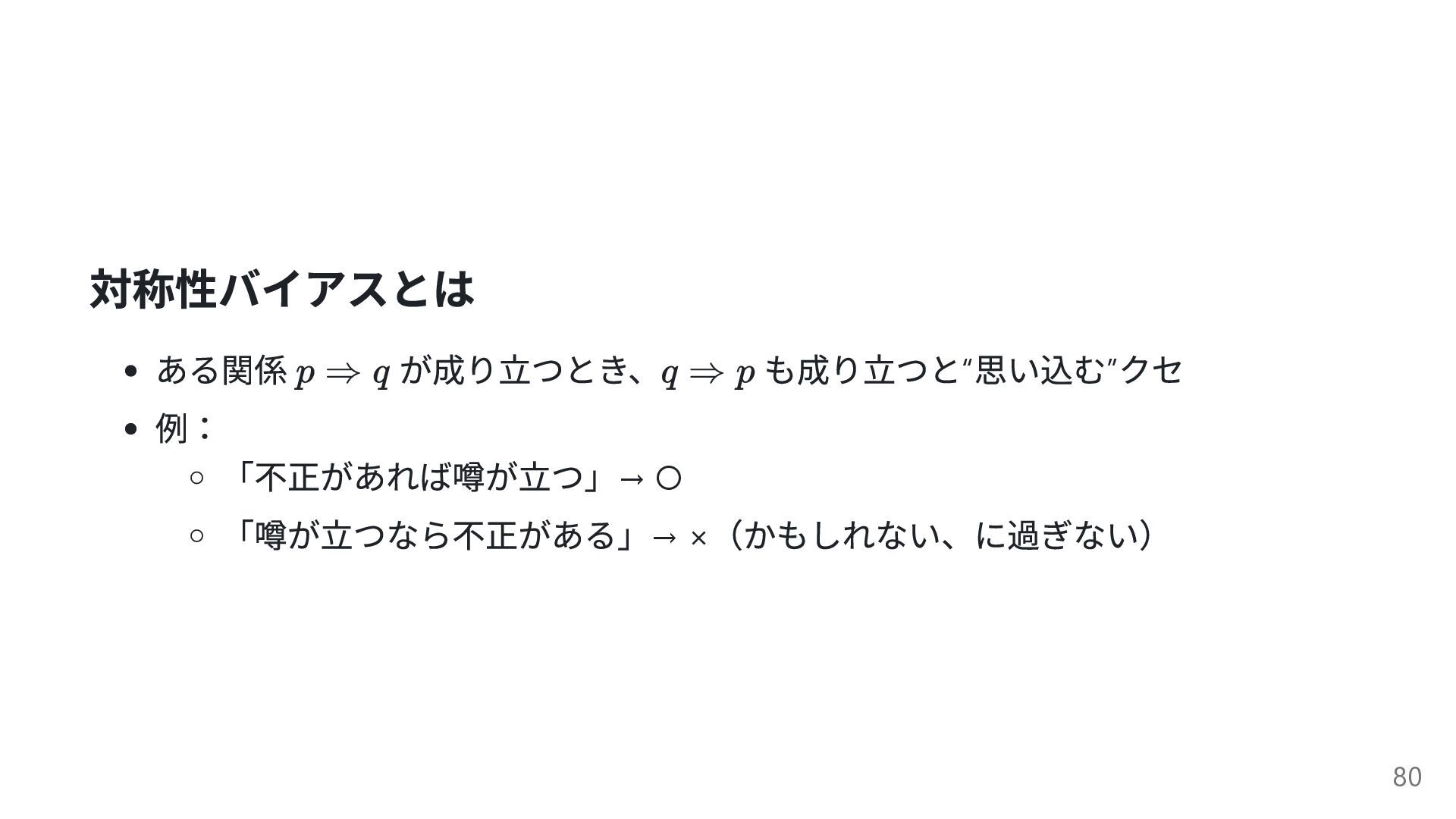 対称性バイアスとは ある関係 が成り立つとき、 も成り立つと“ 思い込む” クセ 例: 「不正があれば噂が立つ」→ ◦ 「噂が立つなら不正がある」→