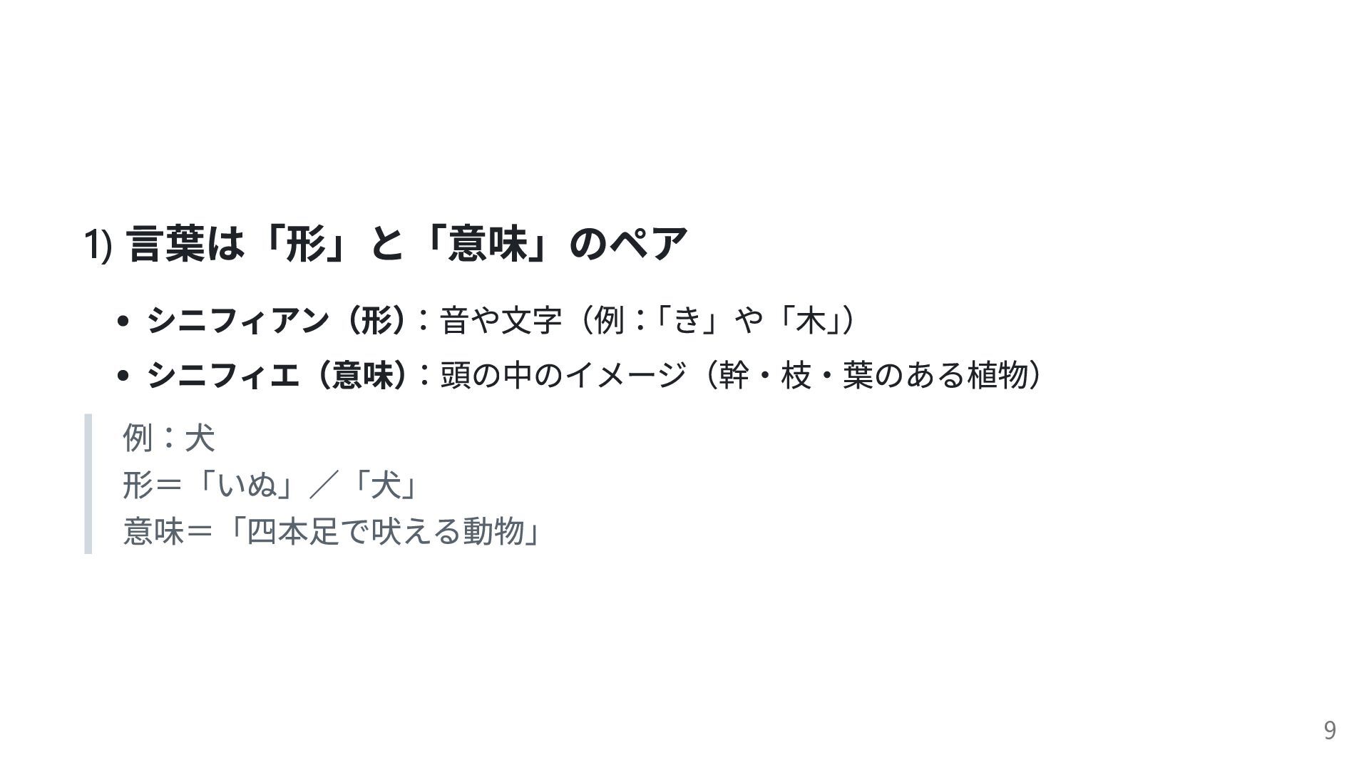 1) 言葉は「形」と「意味」のペア シニフィアン(形) :音や文字(例: 「き」や「木」 ) シニフィエ(意味) :頭の中のイメージ(幹・枝・葉のある植物) 例:犬 形=「いぬ」/「犬」