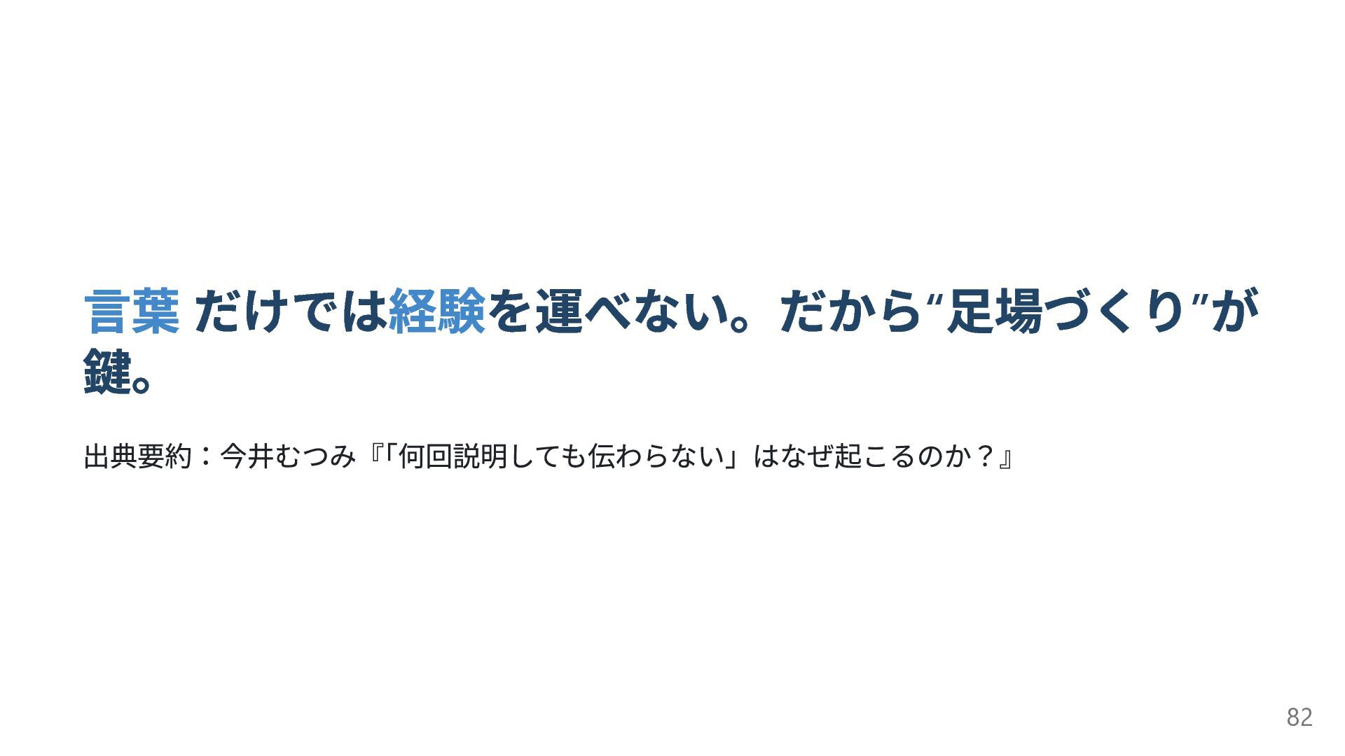 言葉 だけでは経験を運べない。だから“ 足場づくり” が 鍵。 出典要約:今井むつみ『 「何回説明しても伝わらない」はなぜ起こるのか?』 82