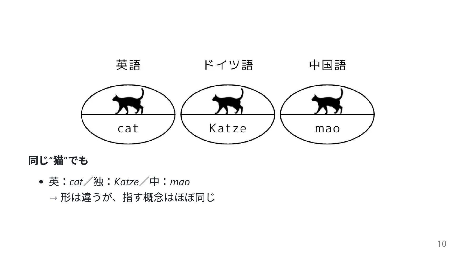 同じ“ 猫” でも 英:cat /独:Katze /中:mao → 形は違うが、指す概念はほぼ同じ 10