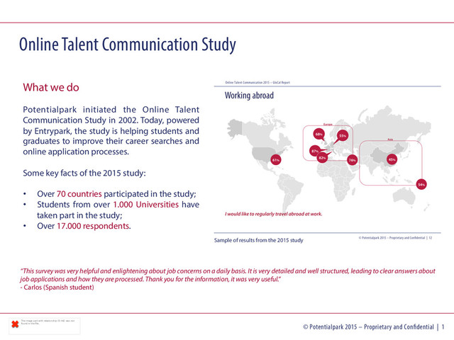 in the file. © Potentialpark 2015 – Proprietary and Con dential | 1 Online Talent Communication Study What we do Potentialpark initiated the Online Talent Communication Study in 2002. Today, powered by Entrypark, the study is helping students and graduates to improve their career searches and online application processes. Some key facts of the 2015 study: • Over 70 countries participated in the study; • Students from over 1.000 Universities have taken part in the study; • Over 17.000 respondents. Sample of results from the 2015 study “This survey was very helpful and enlightening about job concerns on a daily basis. It is very detailed and well structured, leading to clear answers about job applications and how they are processed. Thank you for the information, it was very useful.” - Carlos (Spanish student)