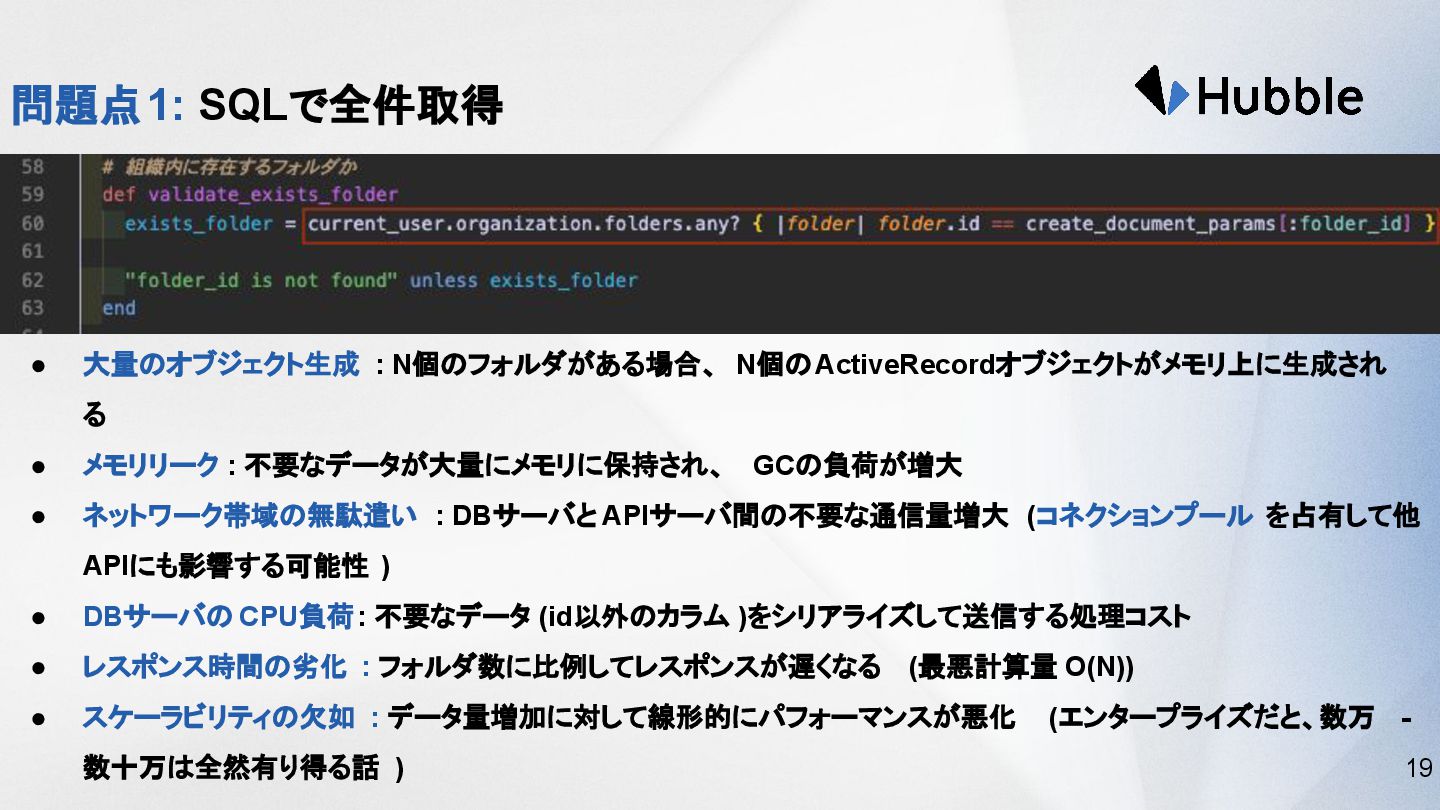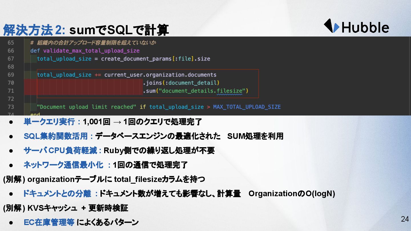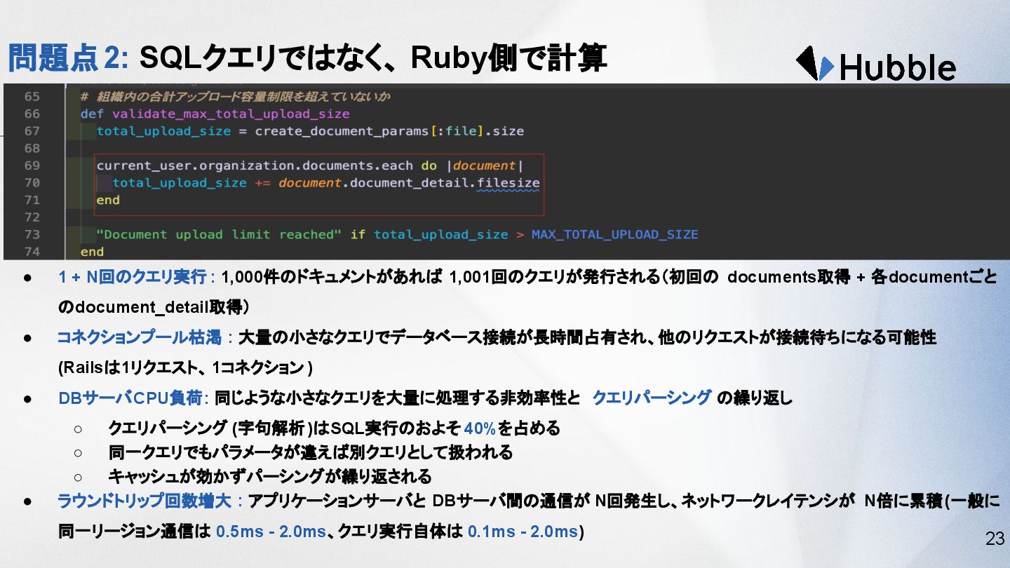 documents取得 + 各documentごと のdocument_detail取得) • コネクションプール枯渇 : 大量の小さなクエリでデータベース接続が長時間占有され、他のリクエストが接続待ちになる可能性 (Railsは1リクエスト、 1コネクション ) • DBサーバCPU負荷: 同じような小さなクエリを大量に処理する非効率性と クエリパーシング の繰り返し ◦ クエリパーシング (字句解析)はSQL実行のおよそ 40%を占める ◦ 同一クエリでもパラメータが違えば別クエリとして扱われる ◦ キャッシュが効かずパーシングが繰り返される • ラウンドトリップ回数増大 : アプリケーションサーバと DBサーバ間の通信が N回発生し、ネットワークレイテンシが N倍に累積(一般に 同一リージョン通信は 0.5ms - 2.0ms、クエリ実行自体は 0.1ms - 2.0ms) 23