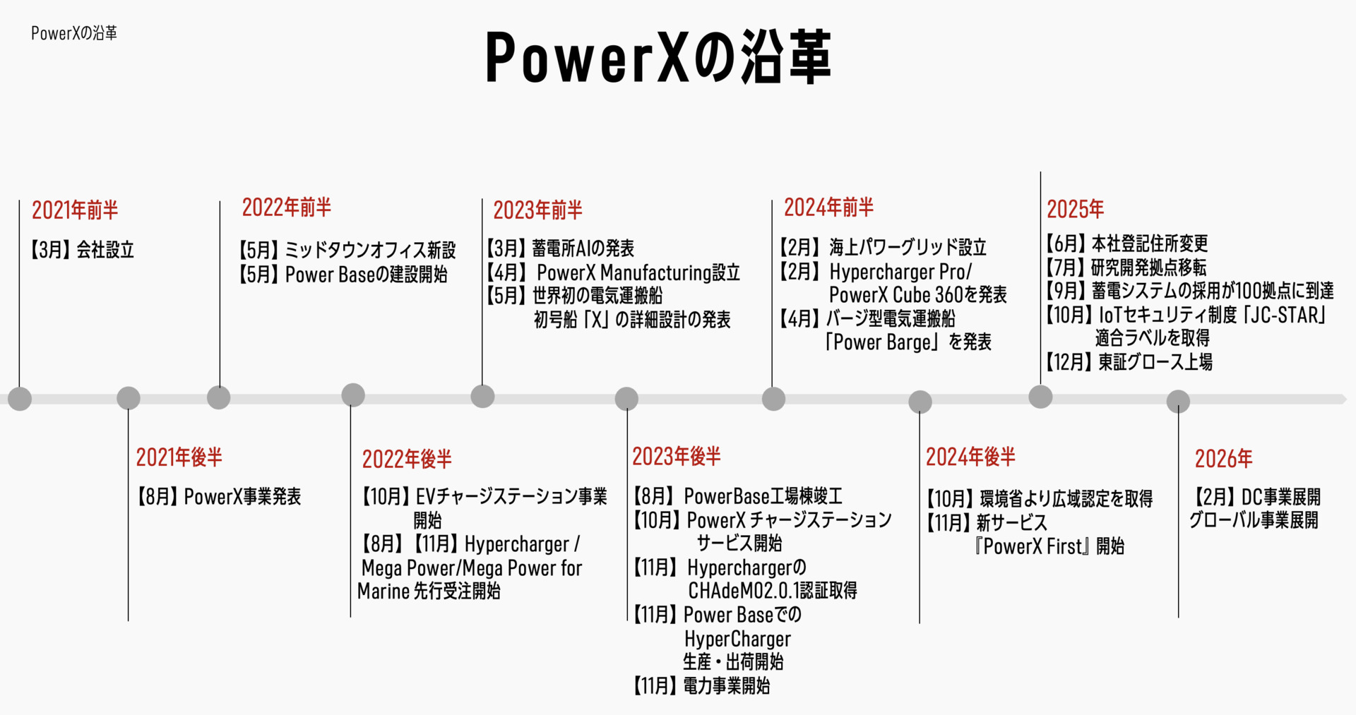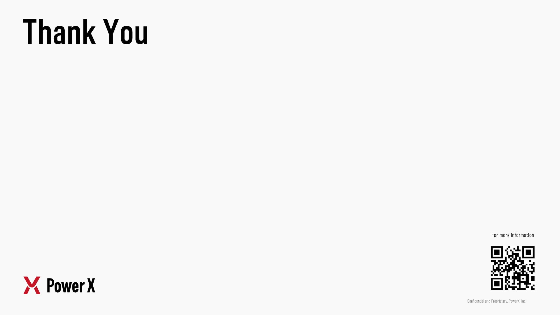 代表者 取締役兼代表執行役社長 CEO 伊藤 正 裕 所在地 本社工場: 〒 706-0001 岡山県玉野市田井 6-9-1 東京 オフィス : 〒 107 -6243 東京都港区赤坂 9-7-1 ミッドタウンタワー 43階 分室 / ショールーム: 〒 106-0032 東京都港区六本木 7丁目 8-6 アクソール六本木 2階 事業内容 大型蓄電池の製造・販売/ EVチャージステーションのサービス展開/電気運搬船の開発・製造 /再生エネルギー等の電力供給 従業員数 165名(2025年 9月時点 ) 資本金 19,494 百万円 ( 6月末時点 。資本準備金 を含 む ) 株式会社 PowerX Manufacturing 設立 2023年 4月 28日 代表者 代表取締役社 長 池添 通 則 〒 706-0001 岡山県玉野市田井 6-9-1 所在地 事業内容 蓄電池関連製品 の 製造請負 資本金 300百 万円 株式会社海上パワーグリッド 設立 2024年 2月 9日 代表者 代表取締役社 長 大西 英之 〒 107 -6243 東京都港区赤坂 9-7-1 ミッドタウンタワー 43階 所在地 事業内容 電気運搬船の開発、販売/電気運搬船を用いた海上電力輸送、電 力販売/船舶用蓄電池の販売 資本金 1,000万円(資本準備金を含む ) Confidential and Proprietary, PowerX, Inc.