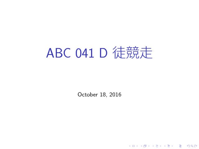 . . . . . . . . . . . . . . . . . . . . . . . . . . . . . . 漸化式を⽴てよう 次に f(S) の漸化式を求めましょう。安易に考えると、S の中 で 1 位になれる可能性のあるウサギさんは多くても n(S) ⽻で す(つまり、S に属するすべてのウサギは 1 位になりうる) 。し かし、ウサギさん情報の存在により 1 位になりうるウサギさん は制限されます。たとえば Sab = {a, b} として a より b のほう が先にゴールしたという情報があるとします。このとき、S の 中で 1 位になりうるのは b のみです(結果は 1 位:b で 2 位:a しかあり得ない) 。したがって、f(S) は S から 1 位になりうる ウサギさん v ∈ S を除いたそれぞれの集合 S − {v} に対する f(S − {v}) の和となります3。 f(S) = ∑ v f(S − {v}) (v : 1 位になりうるウサギさん) 31 位のウサギさん v によって場合分けをすると考えます。