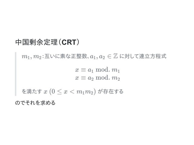 = ext_gcd(m1, m2) # g == 1 じゃないとダメ (a1 + (a2 - a1) * m1 * g) % (m1 * m2) end 実装例 (C++) using i64 = int64_t; i64 crt(i64 a1, i64 a2, i64 m1, i64 m2) { auto xyg = ext_gcd(m1, m2); // xyg[2] == 1 じゃないとダメ auto ret = a1 + (a2 - a1) % m2 * m1 * xyg[0] % m2, m = m1 * m2; return (ret % m + m) % m; }