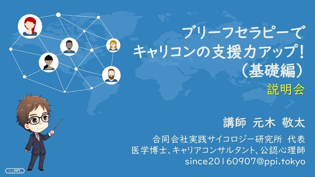 ブリーフセラピーで キャリコンの支援力アップ! (基礎編) 説明会 講師 元木 敬太 合同会社実践サイコロジー研究所 代表 医学博士、キャリアコンサルタント、公認心理師