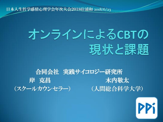 日本人生哲学感情心理学会(旧論理療法学会)年次大会2018の発表資料。オンラインCBTの効果研究の現状を概観し、実際の取り組み事例、今後の課題について論じた。現状、オンラインCBTは治療効果と費用対効果が認められているが、今後、アクティブコントロールを用いたさらなる検証が必要。実際に合同会社実践サイコロジー研究所が行っているテキスト相談ではポジティブなフィードバックを多数受けている。今後、厳格なデザインによる効果検証が必要。英国からはガイドラインが発表されている。ガイドラインを整備する必要がある。