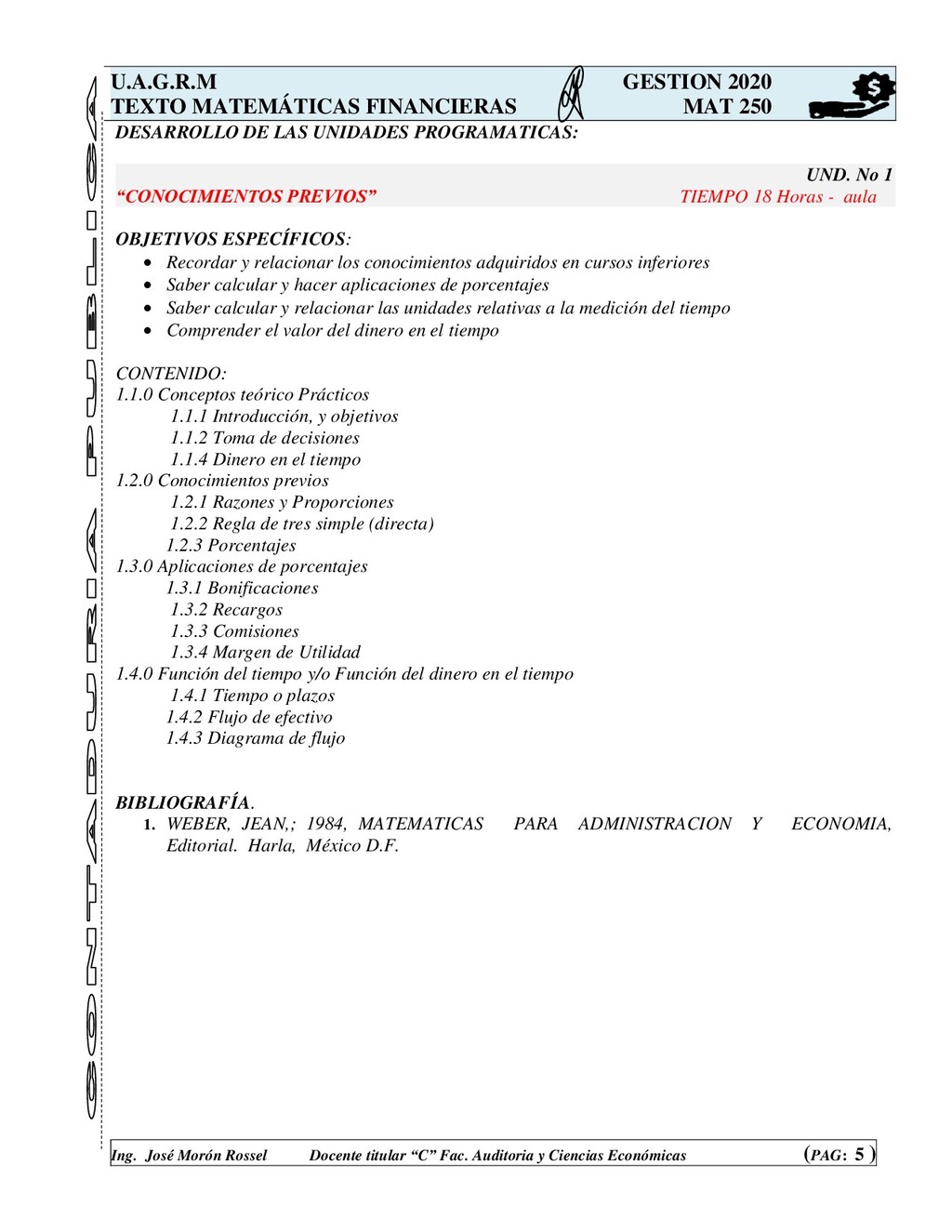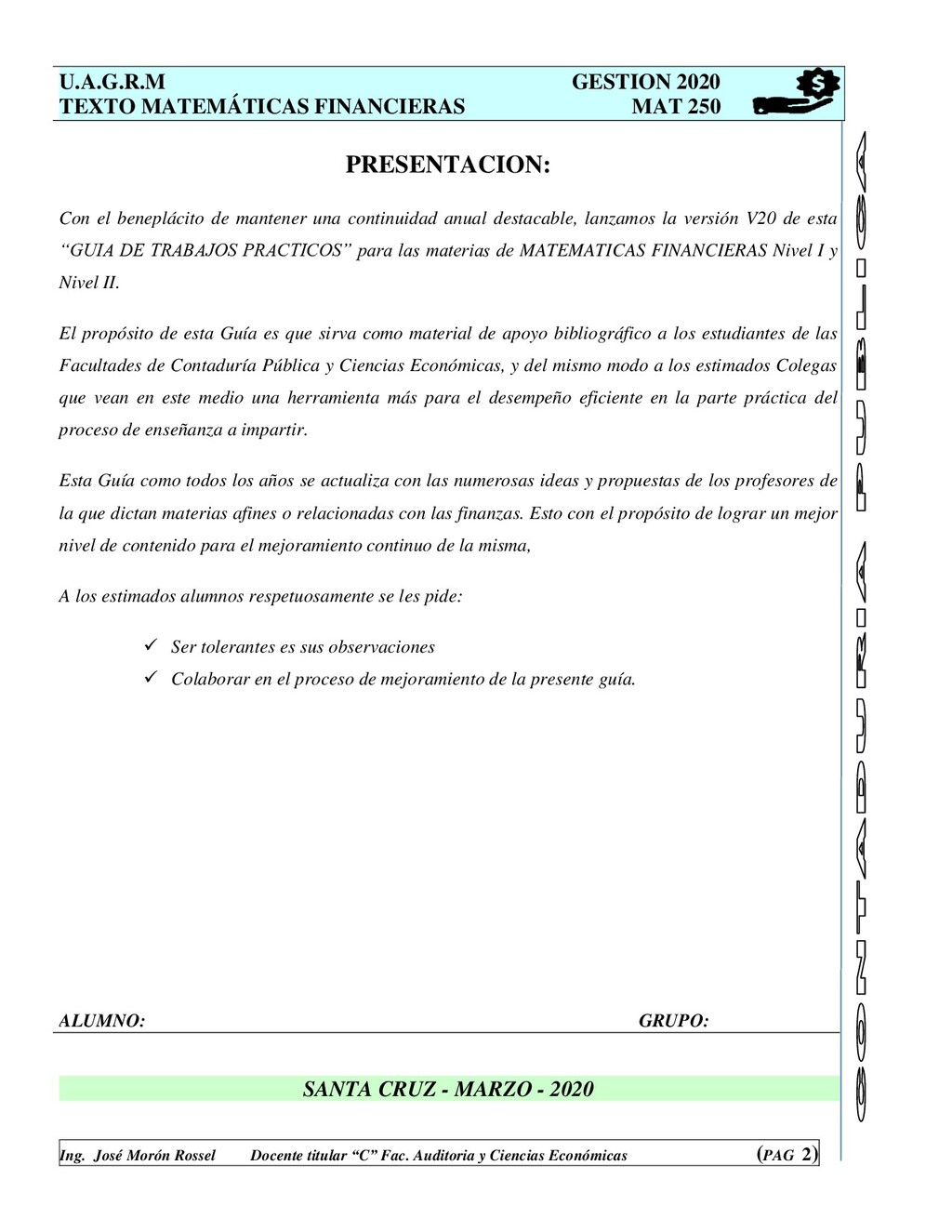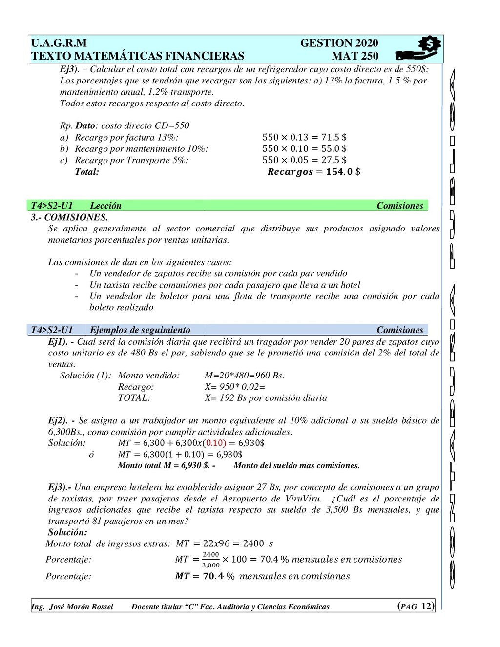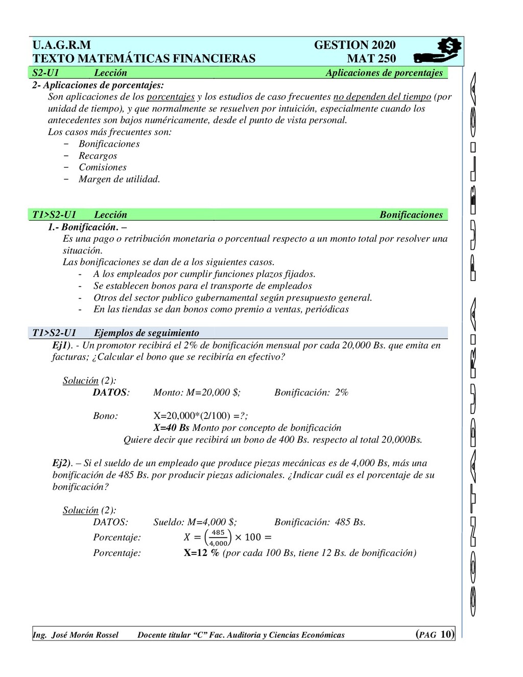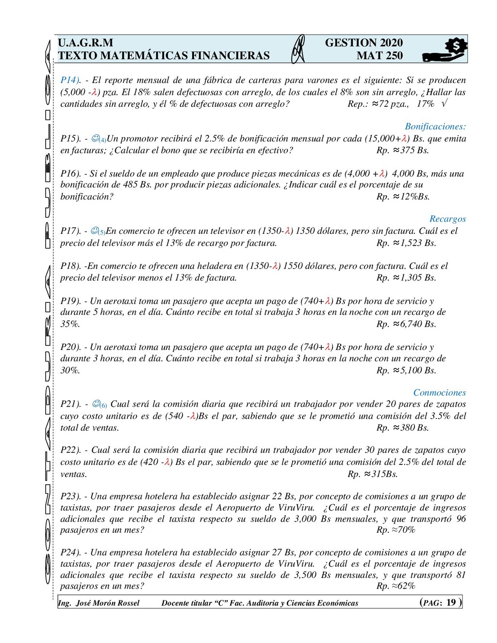 Morón Rossel Docente titular “C” Fac. Auditoria y Ciencias Económicas (PAG: 19 ) P14). - El reporte mensual de una fábrica de carteras para varones es el siguiente: Si se producen (5,000 -) pza. El 18% salen defectuosas con arreglo, de los cuales el 8% son sin arreglo, ¿Hallar las cantidades sin arreglo, y él % de defectuosas con arreglo? Rep.: ≈72 pza., 17% Bonificaciones: P15). - (4)Un promotor recibirá el 2.5% de bonificación mensual por cada (15,000+) Bs. que emita en facturas; ¿Calcular el bono que se recibiría en efectivo? Rp. ≈375 Bs. P16). - Si el sueldo de un empleado que produce piezas mecánicas es de (4,000 +) 4,000 Bs, más una bonificación de 485 Bs. por producir piezas adicionales. ¿Indicar cuál es el porcentaje de su bonificación? Rp. ≈12%Bs. Recargos P17). - (5)En comercio te ofrecen un televisor en (1350-) 1350 dólares, pero sin factura. Cuál es el precio del televisor más el 13% de recargo por factura. Rp. ≈1,523 Bs. P18). -En comercio te ofrecen una heladera en (1350-) 1550 dólares, pero con factura. Cuál es el precio del televisor menos el 13% de factura. Rp. ≈1,305 Bs. P19). - Un aerotaxi toma un pasajero que acepta un pago de (740+) Bs por hora de servicio y durante 5 horas, en el día. Cuánto recibe en total si trabaja 3 horas en la noche con un recargo de 35%. Rp. ≈6,740 Bs. P20). - Un aerotaxi toma un pasajero que acepta un pago de (740+) Bs por hora de servicio y durante 3 horas, en el día. Cuánto recibe en total si trabaja 3 horas en la noche con un recargo de 30%. Rp. ≈5,100 Bs. Conmociones P21). - (6) Cual será la comisión diaria que recibirá un trabajador por vender 20 pares de zapatos cuyo costo unitario es de (540 -)Bs el par, sabiendo que se le prometió una comisión del 3.5% del total de ventas. Rp. ≈380 Bs. P22). - Cual será la comisión diaria que recibirá un trabajador por vender 30 pares de zapatos cuyo costo unitario es de (420 -) Bs el par, sabiendo que se le prometió una comisión del 2.5% del total de ventas. Rp. ≈315Bs. P23). - Una empresa hotelera ha establecido asignar 22 Bs, por concepto de comisiones a un grupo de taxistas, por traer pasajeros desde el Aeropuerto de ViruViru. ¿Cuál es el porcentaje de ingresos adicionales que recibe el taxista respecto su sueldo de 3,000 Bs mensuales, y que transportó 96 pasajeros en un mes? Rp. ≈70% P24). - Una empresa hotelera ha establecido asignar 27 Bs, por concepto de comisiones a un grupo de taxistas, por traer pasajeros desde el Aeropuerto de ViruViru. ¿Cuál es el porcentaje de ingresos adicionales que recibe el taxista respecto su sueldo de 3,500 Bs mensuales, y que transportó 81 pasajeros en un mes? Rp. ≈62%