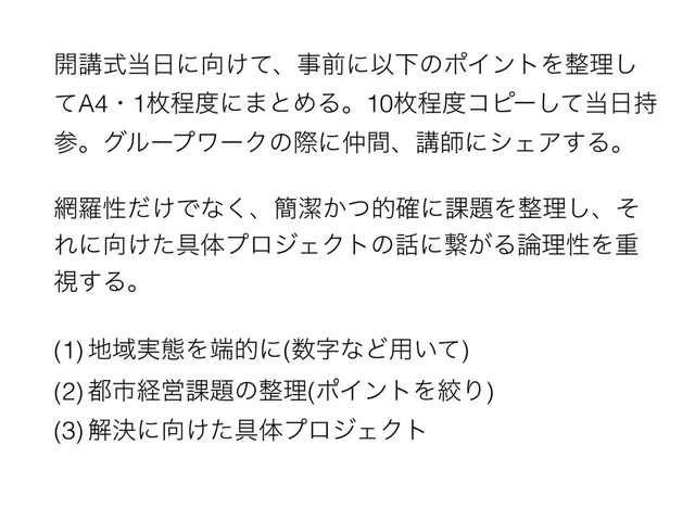 ։ߨࣜʹ͚ͯɺࣄલʹҎԼͷϙΠϯτΛཧ͠ ͯA4ɾ1ຕఔʹ·ͱΊΔɻ10ຕఔίϐʔͯ࣋͠ ࢀɻάϧʔϓϫʔΫͷࡍʹؒɺߨࢣʹγΣΞ͢Δɻ ཏੑ͚ͩͰͳ͘ɺ؆͔ܿͭత֬ʹ՝Λཧ͠ɺͦ Εʹ͚ͨ۩ମϓϩδΣΫτͷʹܨ͕ΔཧੑΛॏ ࢹ͢Δɻ (1) Ҭ࣮ଶΛతʹ(ࣈͳͲ༻͍ͯ) (2) ࢢܦӦ՝ͷཧ(ϙΠϯτΛߜΓ)