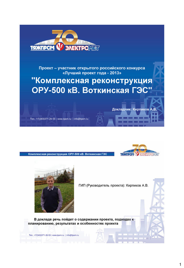 - 2013» "Комплексная реконструкция ОРУ-500 кВ. Воткинская ГЭС" Тел.: +7(343)371-26-55 | www.tpem.ru | [email protected] Докладчик: Кирпиков А.В. Комплексная реконструкция ОРУ-500 кВ. Воткинская ГЭС Тел.: +7(343)371-26-55 | www.tpem.ru | [email protected] В докладе речь пойдет о содержании проекта, подходах к планированию, результатах и особенностях проекта ГИП (Руководитель проекта): Кирпиков А.В.