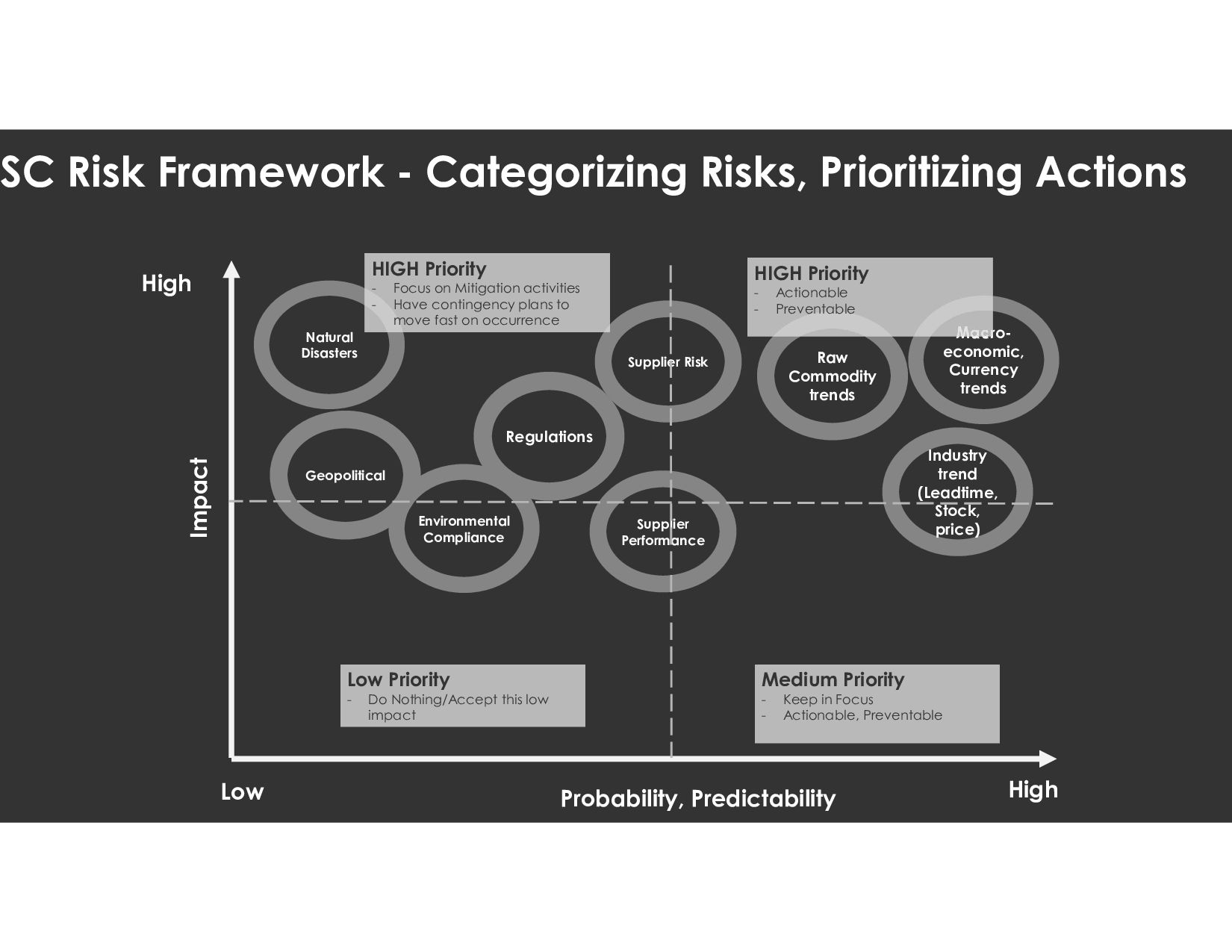 High Probability, Predictability Impact Geopolitical Natural Disasters Regulations Environmental Compliance Raw Commodity trends Supplier Performance Macro- economic, Currency trends Industry trend (Leadtime, Stock, price) Supplier Risk HIGH Priority - Focus on Mitigation activities - Have contingency plans to move fast on occurrence HIGH Priority - Actionable - Preventable Medium Priority - Keep in Focus - Actionable, Preventable Low Priority - Do Nothing/Accept this low impact