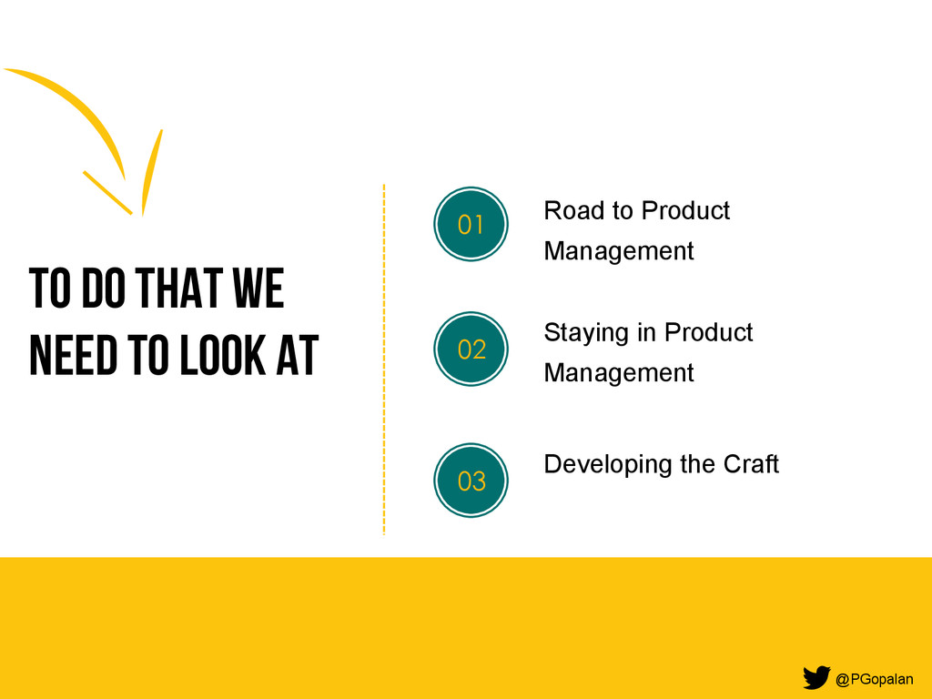Job background Technical (Dev/SE) Business Analyst Other PM Domain background Non SME SME Own Product Vision & Strategy Enable Sales Articulate Product Positioning Craft Release Strategy Determine Market Needs Champion Customer Success What the pm does @PGopalan ”Anecdata”