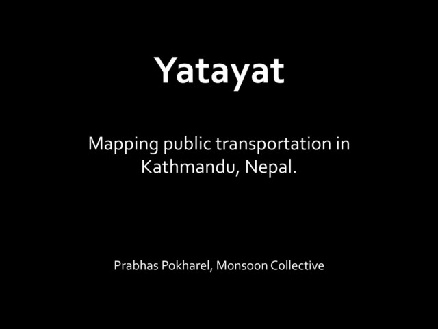 students and OSM-‐Nepal members to continue data upkeep. http://groups.google.com/ group/yatayat-‐project Shout out! Thanks Suresh Shrestha and Amrit Karmacharya for keeping the project alive and going!
