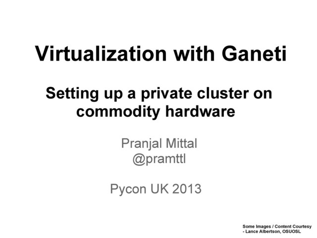 com’nds: http://wiki.osuosl.org/public/ganeti/common_commands Ganeti Rest API docs: http://docs.ganeti.org/ganeti/current/html/rapi.html Ganeti Web Manger docs: https://ganeti-webmgr.readthedocs.org/en/latest/ Ganeti Web Manager Source: https://github.com/osuosl/ganeti_webmgr Run a Virtual Ganeti Cluster: https://github.com/ramereth/vagrant-ganeti