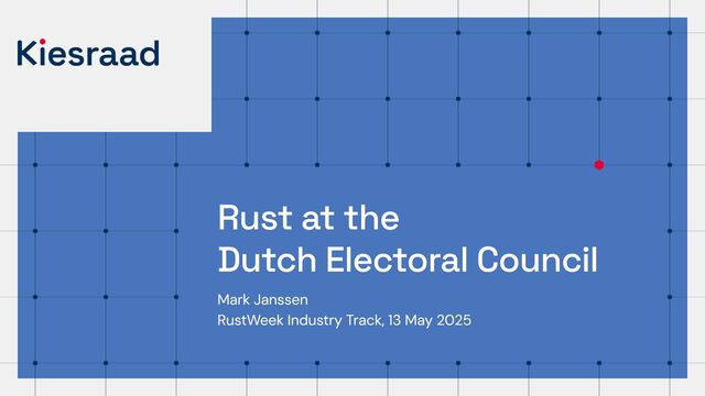 to hire senior developer1 Y Medior developers able to learn RusR Y Ecosystem has crates for almost everythinC Y Stable, although many crates only have 0.x release1 Y Crates for e.g. XML are lacking compared to other language1 Y Limited availability of third party code quality and architecture toolinC Y Would definitely choose Rust again! 17