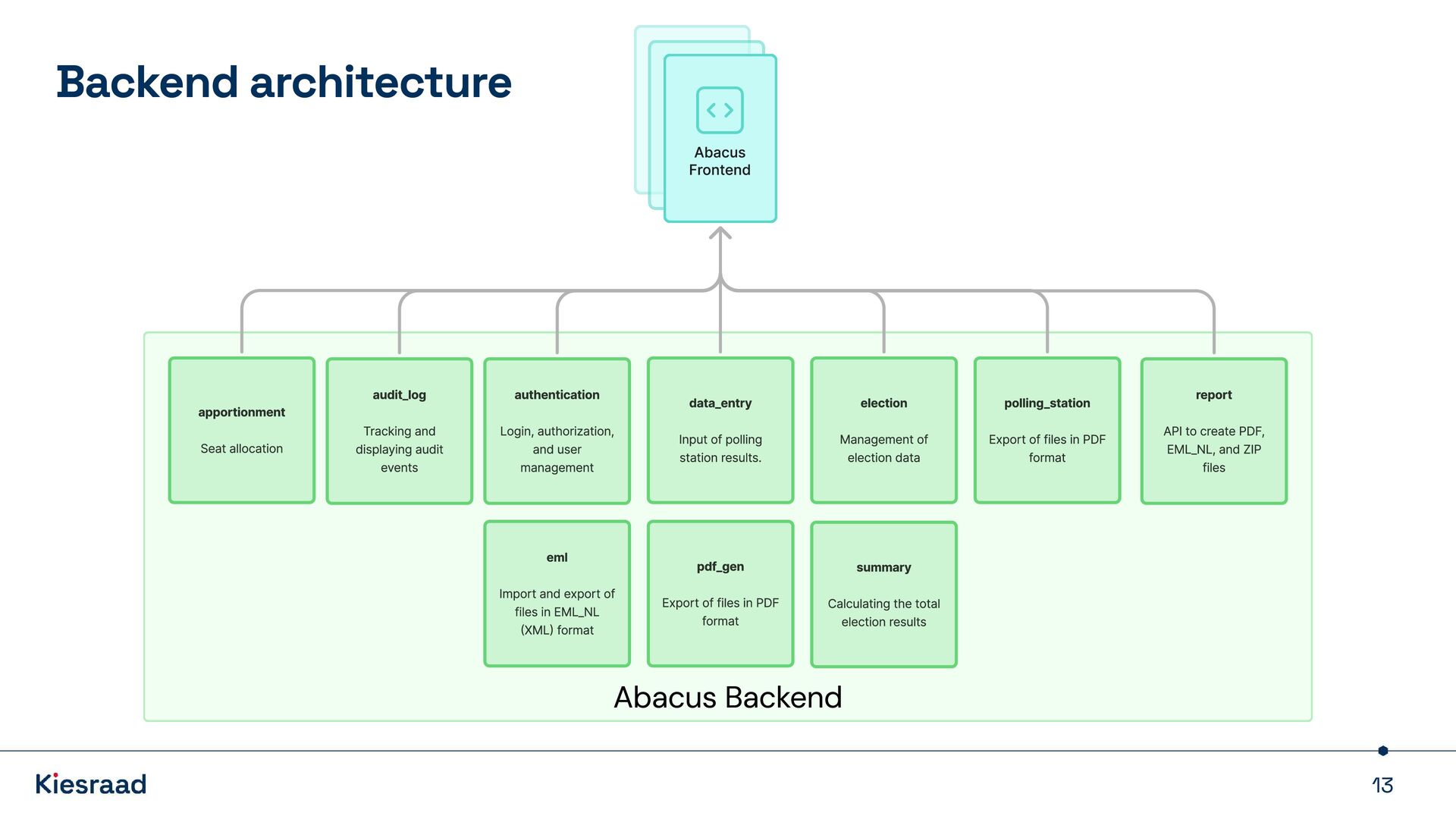 Input of polling station results. election Management of election data eml Import and export of files in EML_NL (XML) format pdf_gen Export of files in PDF format polling_station Export of files in PDF format report API to create PDF, EML_NL, and ZIP files summary Calculating the total election results audit_log Tracking and displaying audit events Backend architecture Abacus Backend Abacus Frontend 13