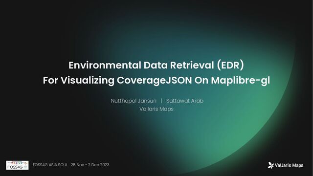EDR (Environmental Data Retrieval) is a standard developed by the Open Geospatial Consortium (OGC). It modern way for access raster analysis ready data (ARD). Users have the capability to request data using services Application Programming Interface (API). EDR is patterns of structure CoverageJSON. CoverageJSON same like JSON format. Users can specific area or bounding box to retrieve raster data. See response : https://ogcapi.ogc.org/edr/ API CoverageJSON FOSS4G ASIA SOUL 28 Nov - 2 Dec 2023