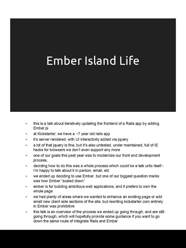 updating the frontend of a Rails app by adding Ember.js - at Kickstarter, we have a ~7 year old rails app - it’s server rendered, with UI interactivity added via jquery - a lot of that jquery is fine, but it’s also untested, under maintained, full of IE hacks for browsers we don’t even support any more - one of our goals this past year was to modernize our front end development process, - deciding how to do this was a whole process which could be a talk unto itself - I’m happy to talk about it in person, email, etc - we ended up deciding to use Ember, but one of our biggest question marks was how Ember “scaled down” - ember is for building ambitious web applications, and it prefers to own the whole page - we had plenty of areas where we wanted to enhance an existing page or add small new client side sections of the site, but rewriting kickstarter.com entirely in Ember was prohibitive - this talk is an overview of the process we ended up going through, and are still going through, which will hopefully provide some guidance if you want to go down the same route of integrate Rails and Ember