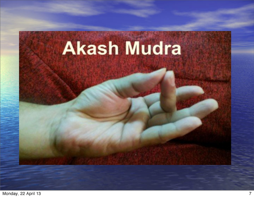 यह बात PपQ हो जाती K| अGगRठा = अिT तज<नी (अGगRठU V पास वाली उGगली) = वाय3 म9यमा (सबM बड़ी अGग3ली) = आकाश अनािमका (चौथी उGगली) = पYZवी क)नि[का (सबM छोटी उGगली) = जल 5 Monday, 22 April 13