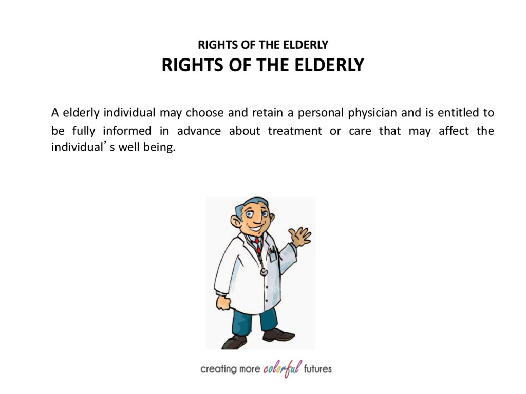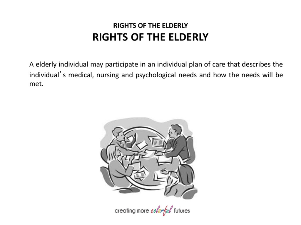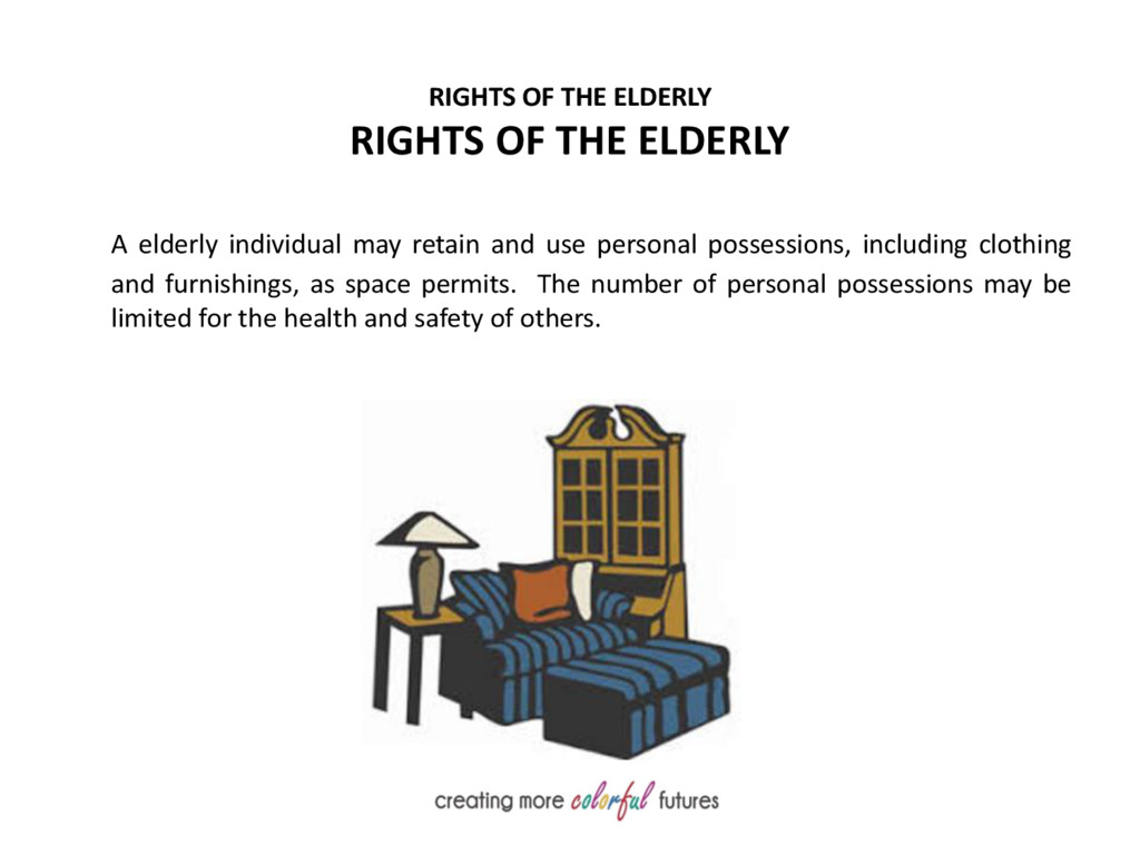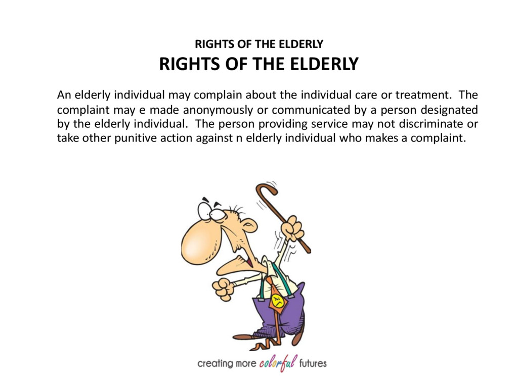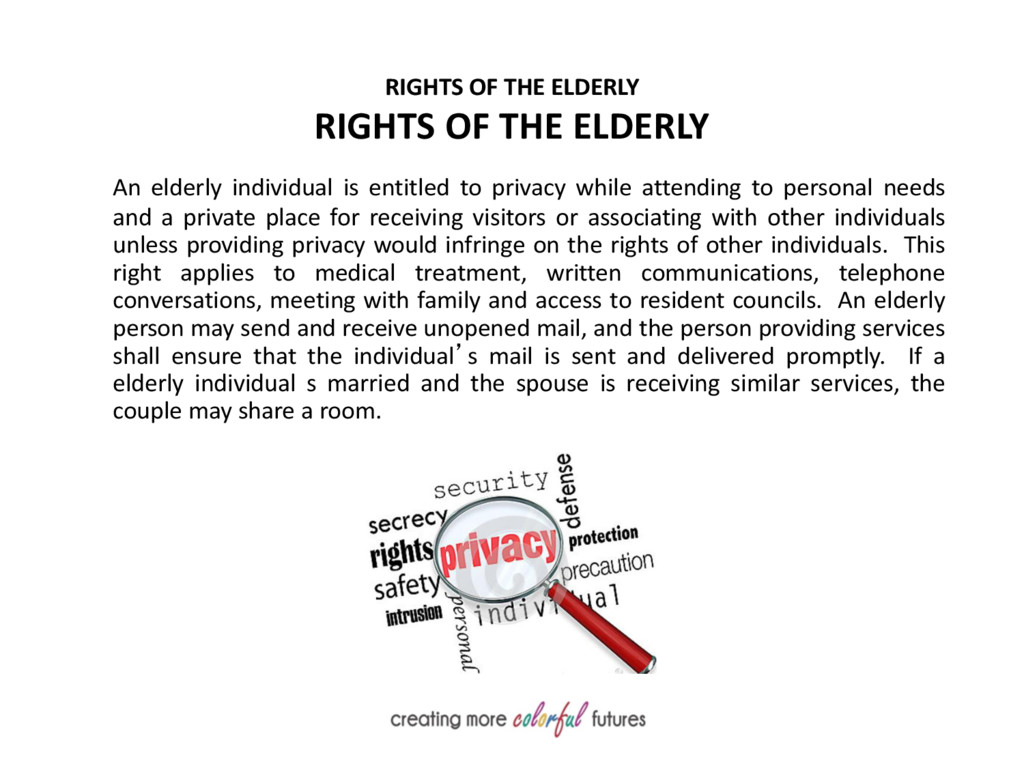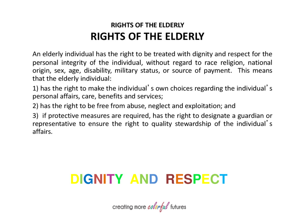 individual has the right to be treated with dignity and respect for the personal integrity of the individual, without regard to race religion, national origin, sex, age, disability, military status, or source of payment. This means that the elderly individual: 1) has the right to make the individual’s own choices regarding the individual’s personal affairs, care, benefits and services; 2) has the right to be free from abuse, neglect and exploitation; and 3) if protective measures are required, has the right to designate a guardian or representative to ensure the right to quality stewardship of the individual’s affairs. DIGNITY AND RESPECT