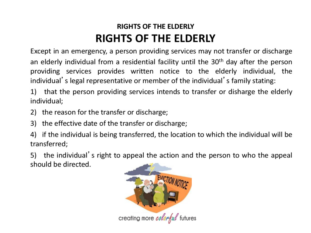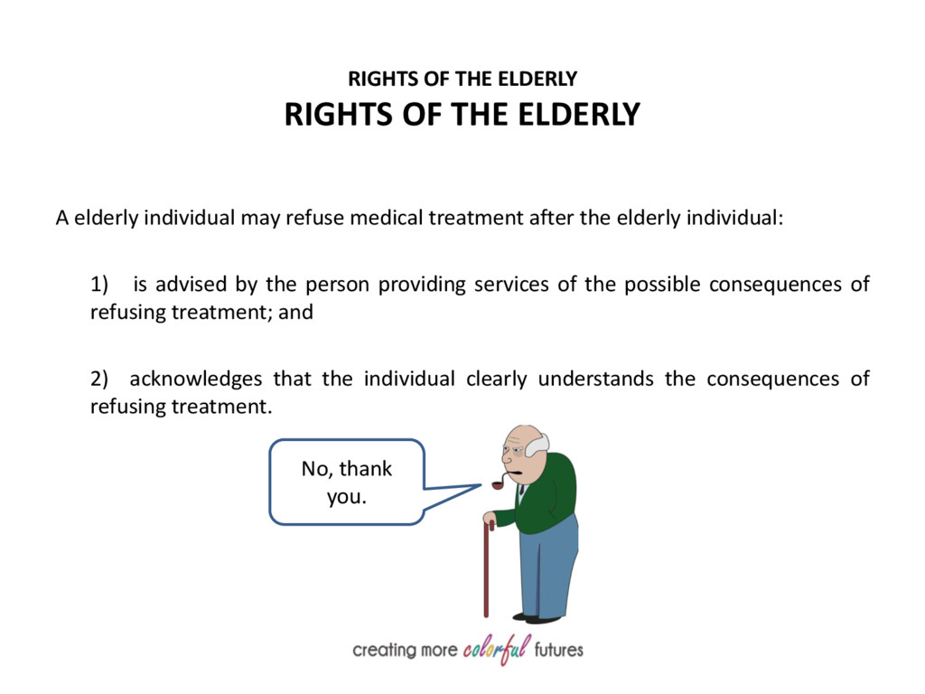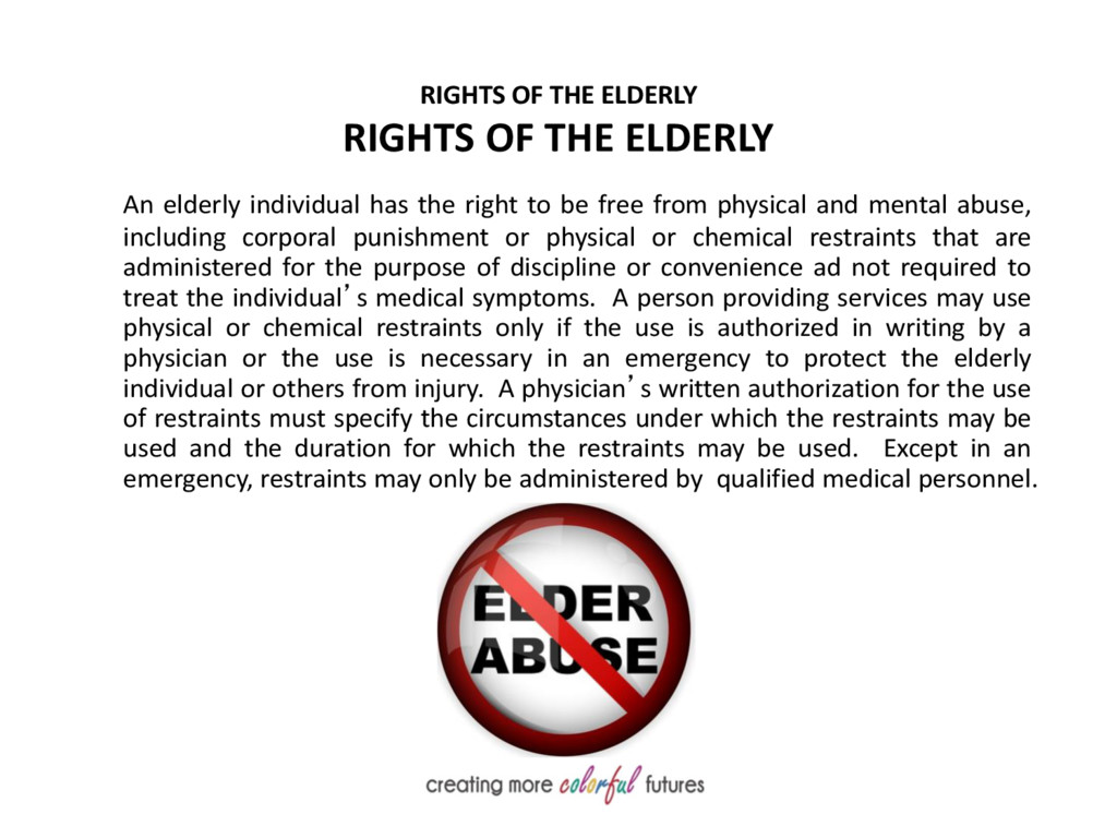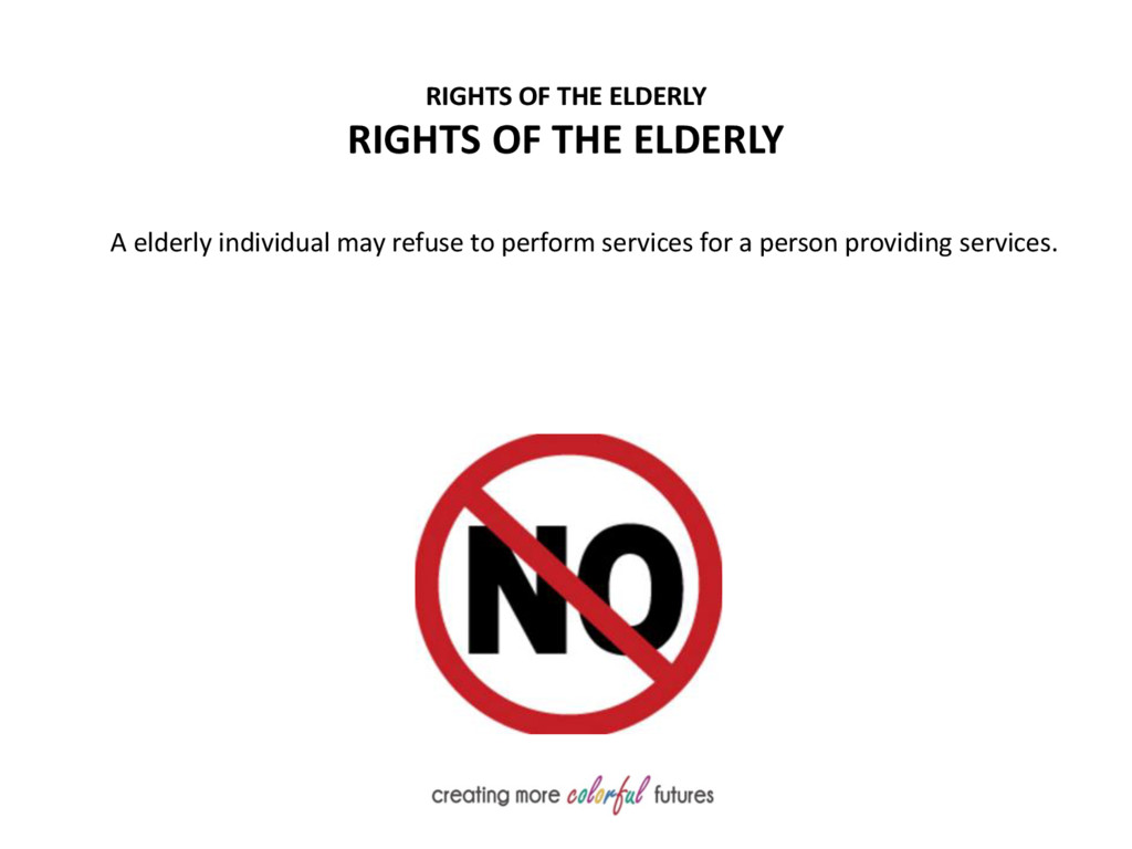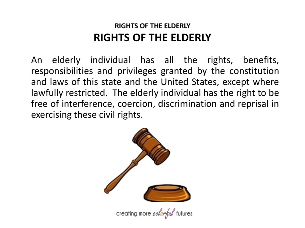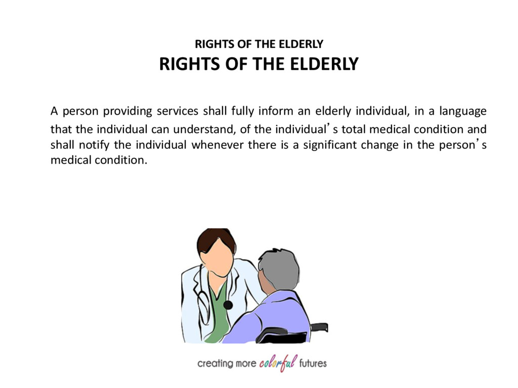 individual has the right to be treated with dignity and respect for the personal integrity of the individual, without regard to race religion, national origin, sex, age, disability, military status, or source of payment. This means that the elderly individual: 1) has the right to make the individual’s own choices regarding the individual’s personal affairs, care, benefits and services; 2) has the right to be free from abuse, neglect and exploitation; and 3) if protective measures are required, has the right to designate a guardian or representative to ensure the right to quality stewardship of the individual’s affairs. DIGNITY AND RESPECT