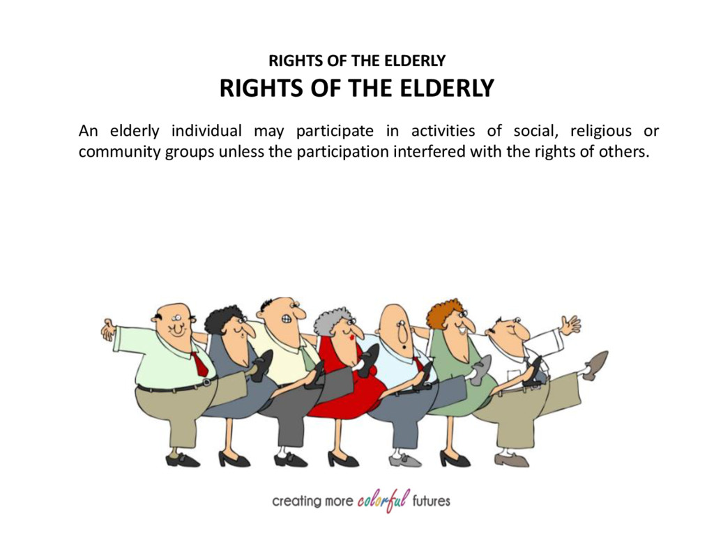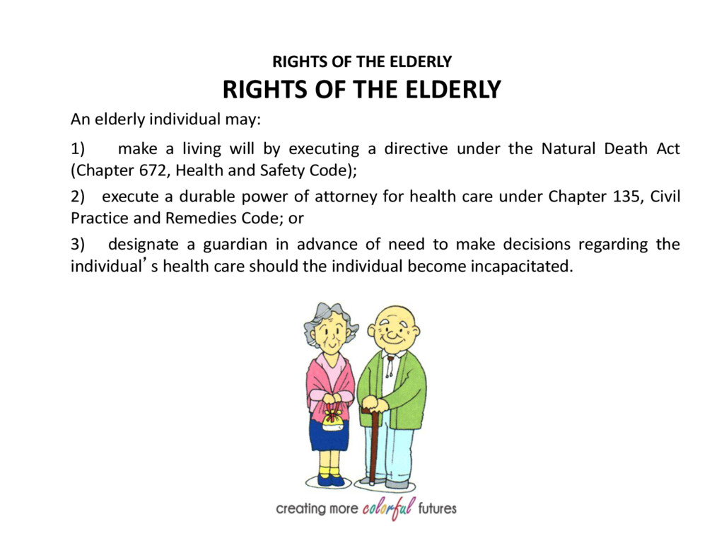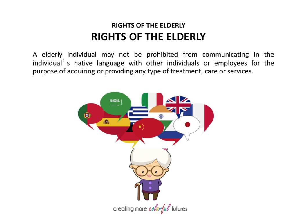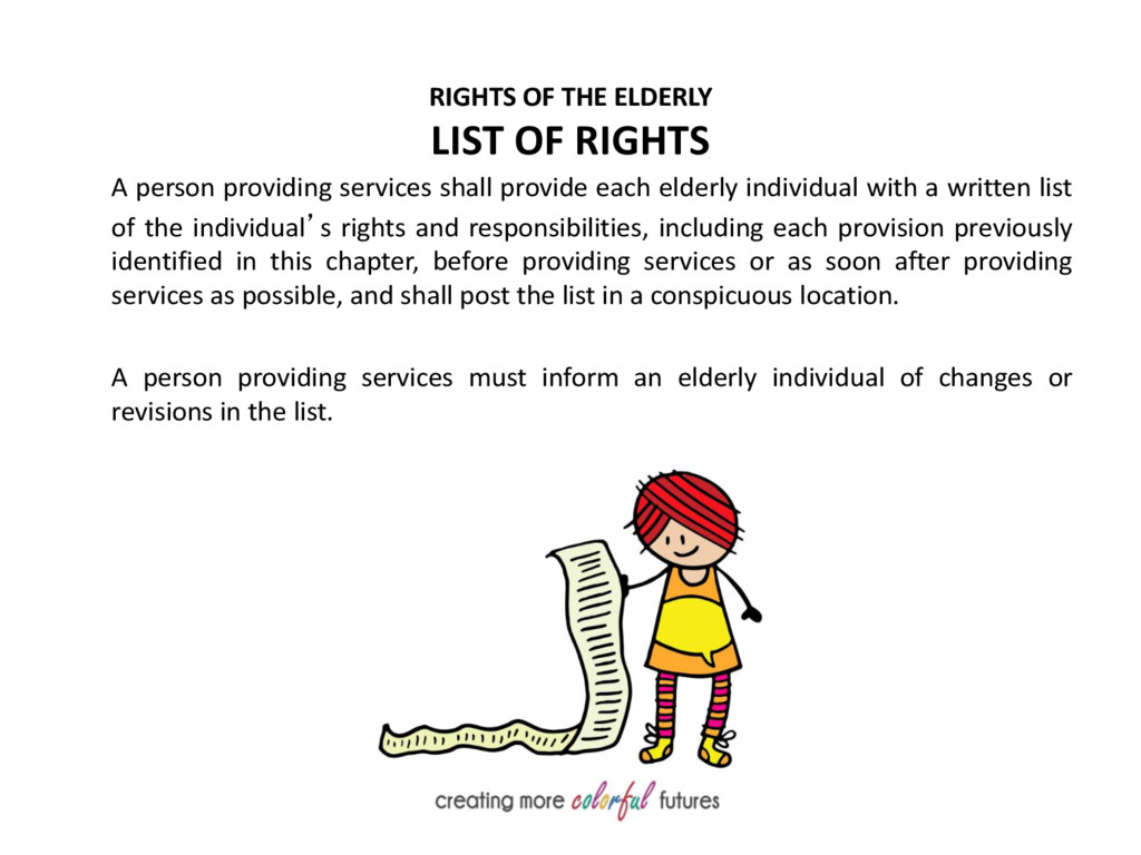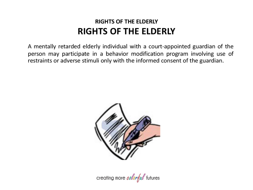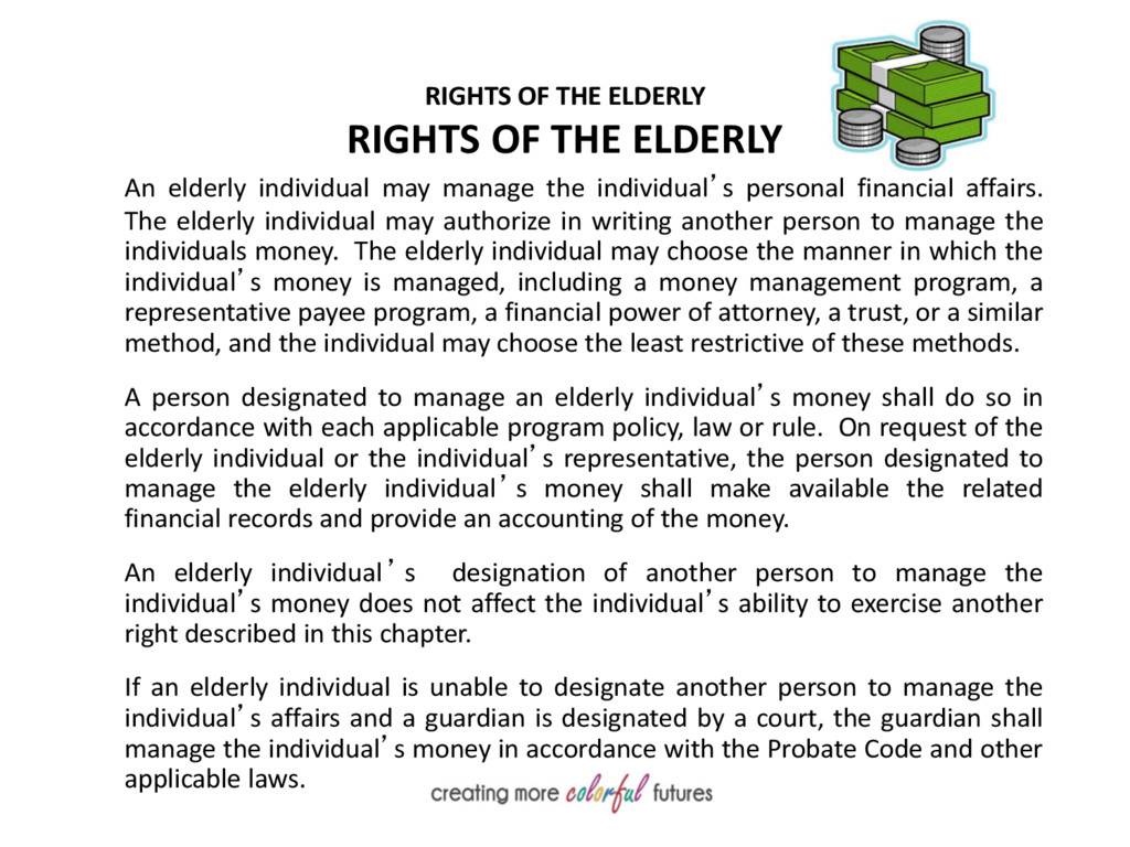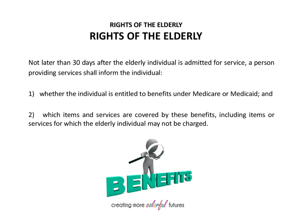 individual has the right to be treated with dignity and respect for the personal integrity of the individual, without regard to race religion, national origin, sex, age, disability, military status, or source of payment. This means that the elderly individual: 1) has the right to make the individual’s own choices regarding the individual’s personal affairs, care, benefits and services; 2) has the right to be free from abuse, neglect and exploitation; and 3) if protective measures are required, has the right to designate a guardian or representative to ensure the right to quality stewardship of the individual’s affairs. DIGNITY AND RESPECT