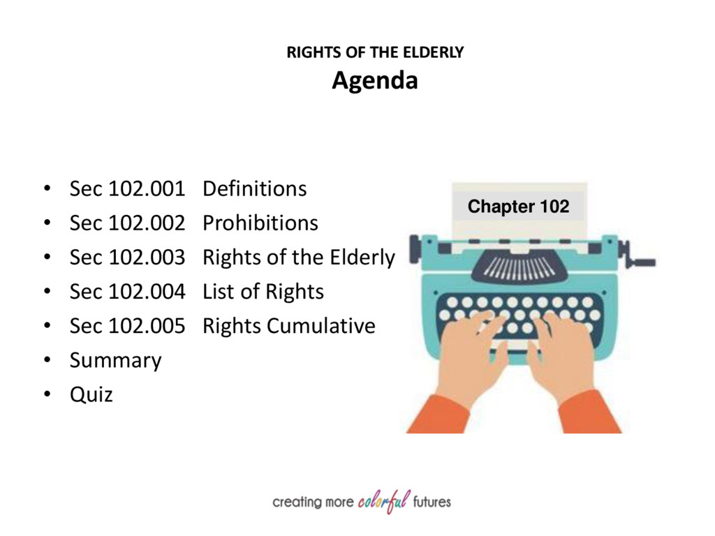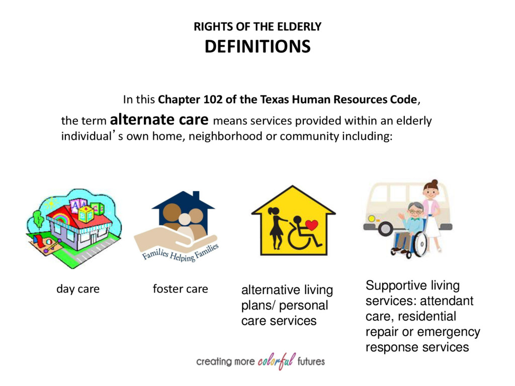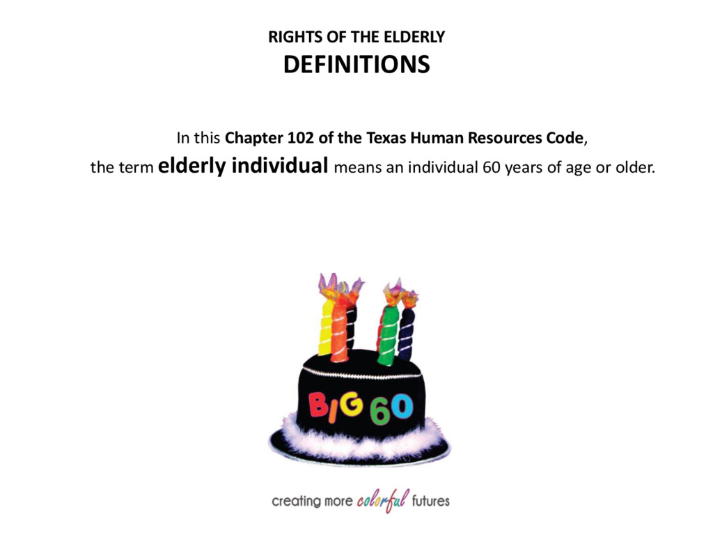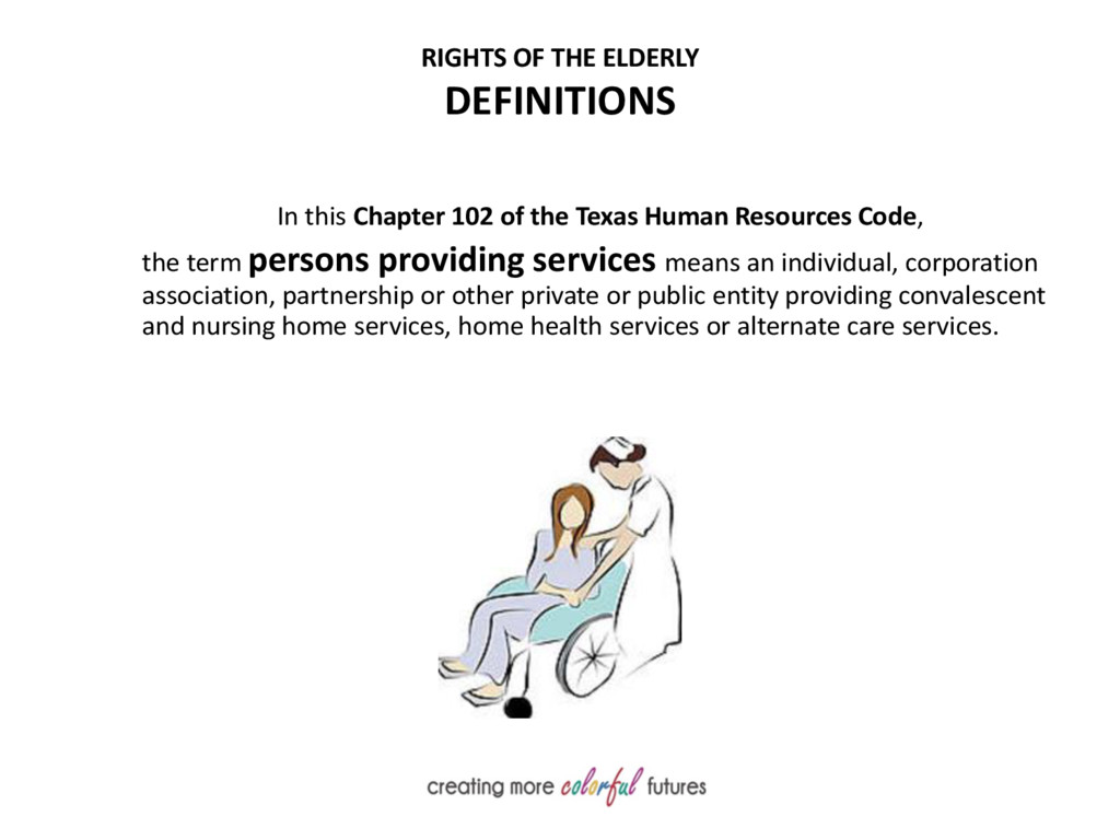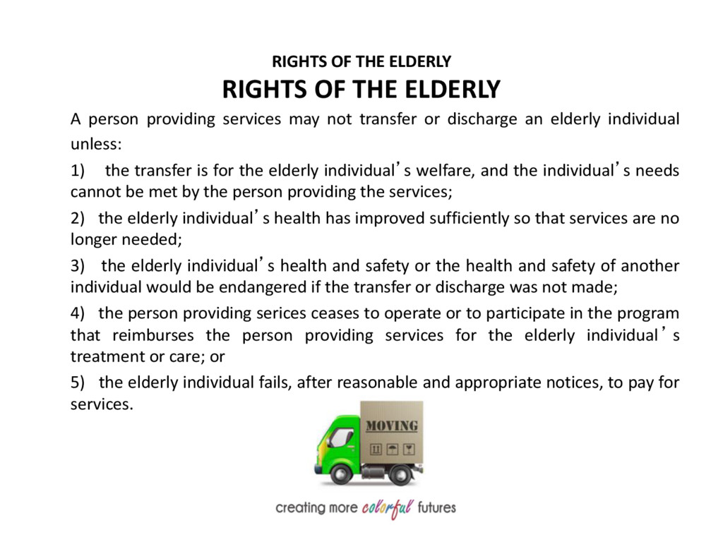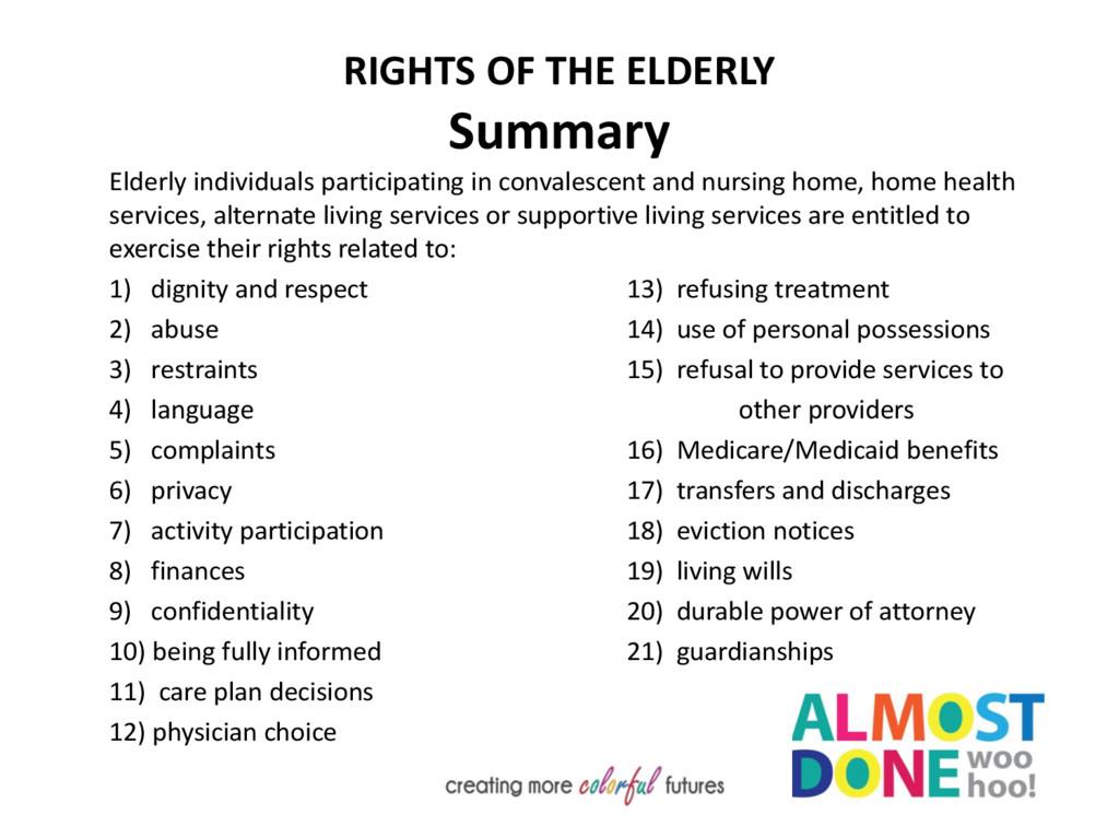 individual has the right to be treated with dignity and respect for the personal integrity of the individual, without regard to race religion, national origin, sex, age, disability, military status, or source of payment. This means that the elderly individual: 1) has the right to make the individual’s own choices regarding the individual’s personal affairs, care, benefits and services; 2) has the right to be free from abuse, neglect and exploitation; and 3) if protective measures are required, has the right to designate a guardian or representative to ensure the right to quality stewardship of the individual’s affairs. DIGNITY AND RESPECT