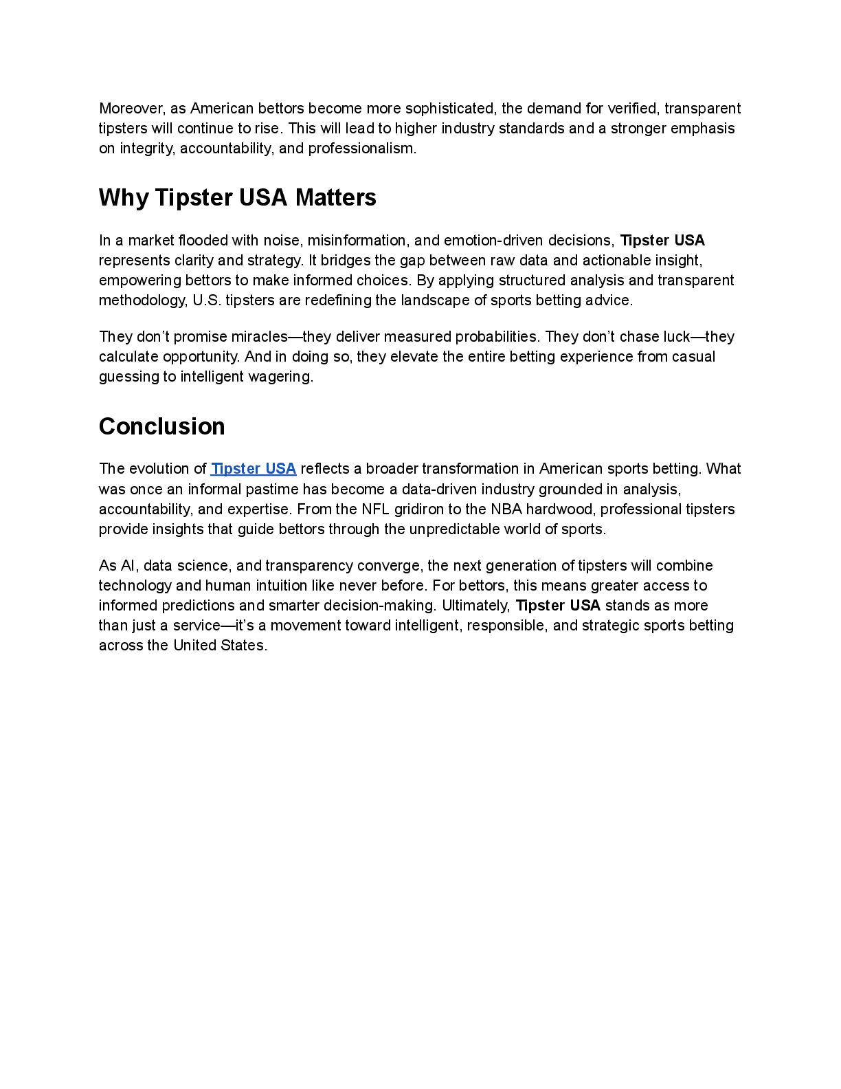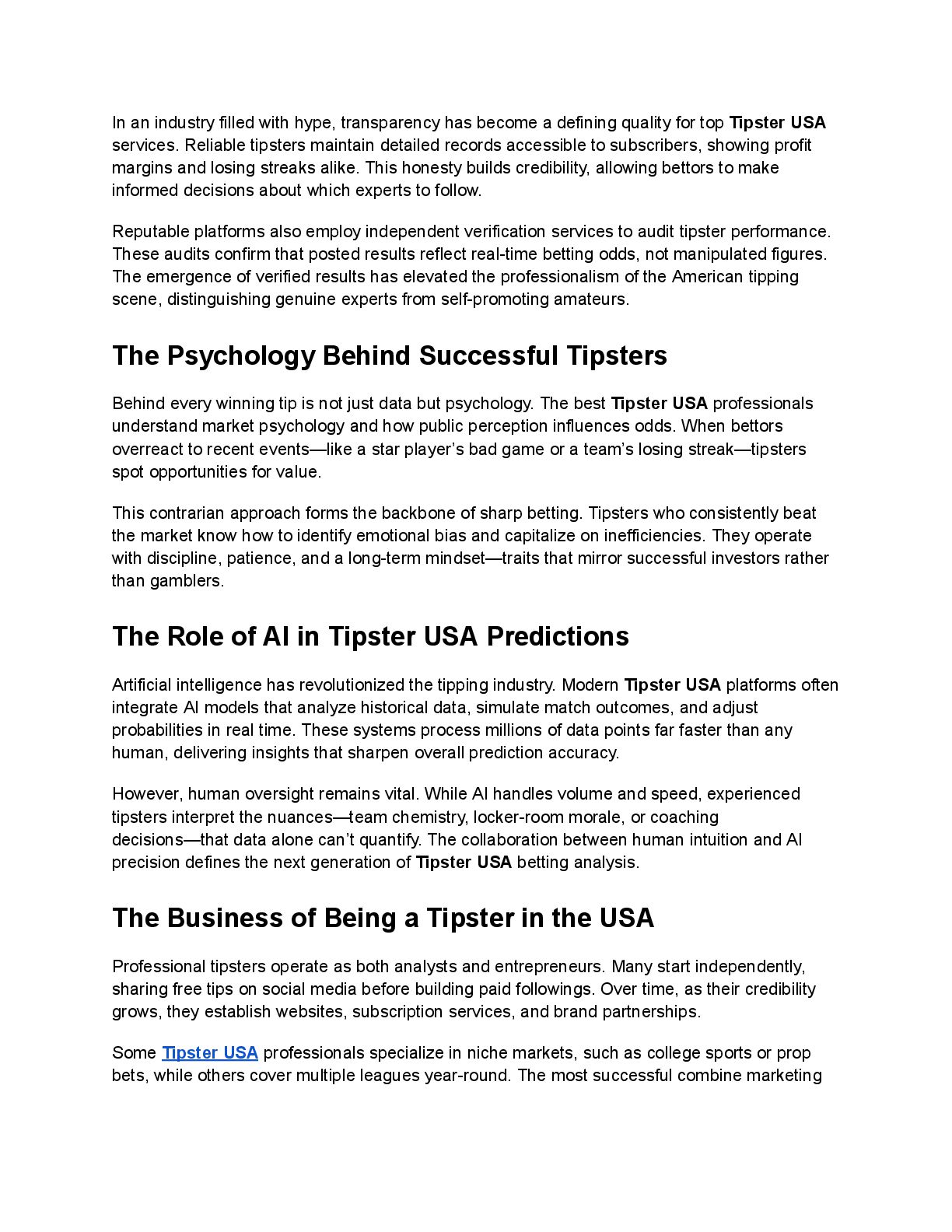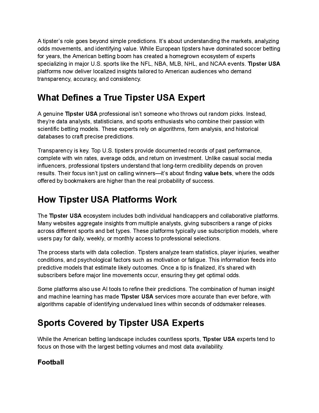the markets, analyzing odds movements, and identifying value. While European tipsters have dominated soccer betting for years, the American betting boom has created a homegrown ecosystem of experts specializing in major U.S. sports like the NFL, NBA, MLB, NHL, and NCAA events. Tipster USA platforms now deliver localized insights tailored to American audiences who demand transparency, accuracy, and consistency. What Defines a True Tipster USA Expert A genuine Tipster USA professional isn’t someone who throws out random picks. Instead, they’re data analysts, statisticians, and sports enthusiasts who combine their passion with scientific betting models. These experts rely on algorithms, form analysis, and historical databases to craft precise predictions. Transparency is key. Top U.S. tipsters provide documented records of past performance, complete with win rates, average odds, and return on investment. Unlike casual social media influencers, professional tipsters understand that long-term credibility depends on proven results. Their focus isn’t just on calling winners—it’s about finding value bets, where the odds offered by bookmakers are higher than the real probability of success. How Tipster USA Platforms Work The Tipster USA ecosystem includes both individual handicappers and collaborative platforms. Many websites aggregate insights from multiple analysts, giving subscribers a range of picks across different sports and bet types. These platforms typically use subscription models, where users pay for daily, weekly, or monthly access to professional selections. The process starts with data collection. Tipsters analyze team statistics, player injuries, weather conditions, and psychological factors such as motivation or fatigue. This information feeds into predictive models that estimate likely outcomes. Once a tip is finalized, it’s shared with subscribers before major line movements occur, ensuring they get optimal odds. Some platforms also use AI tools to refine their predictions. The combination of human insight and machine learning has made Tipster USA services more accurate than ever before, with algorithms capable of identifying undervalued lines within seconds of oddsmaker releases. Sports Covered by Tipster USA Experts While the American betting landscape includes countless sports, Tipster USA experts tend to focus on those with the largest betting volumes and most data availability. Football