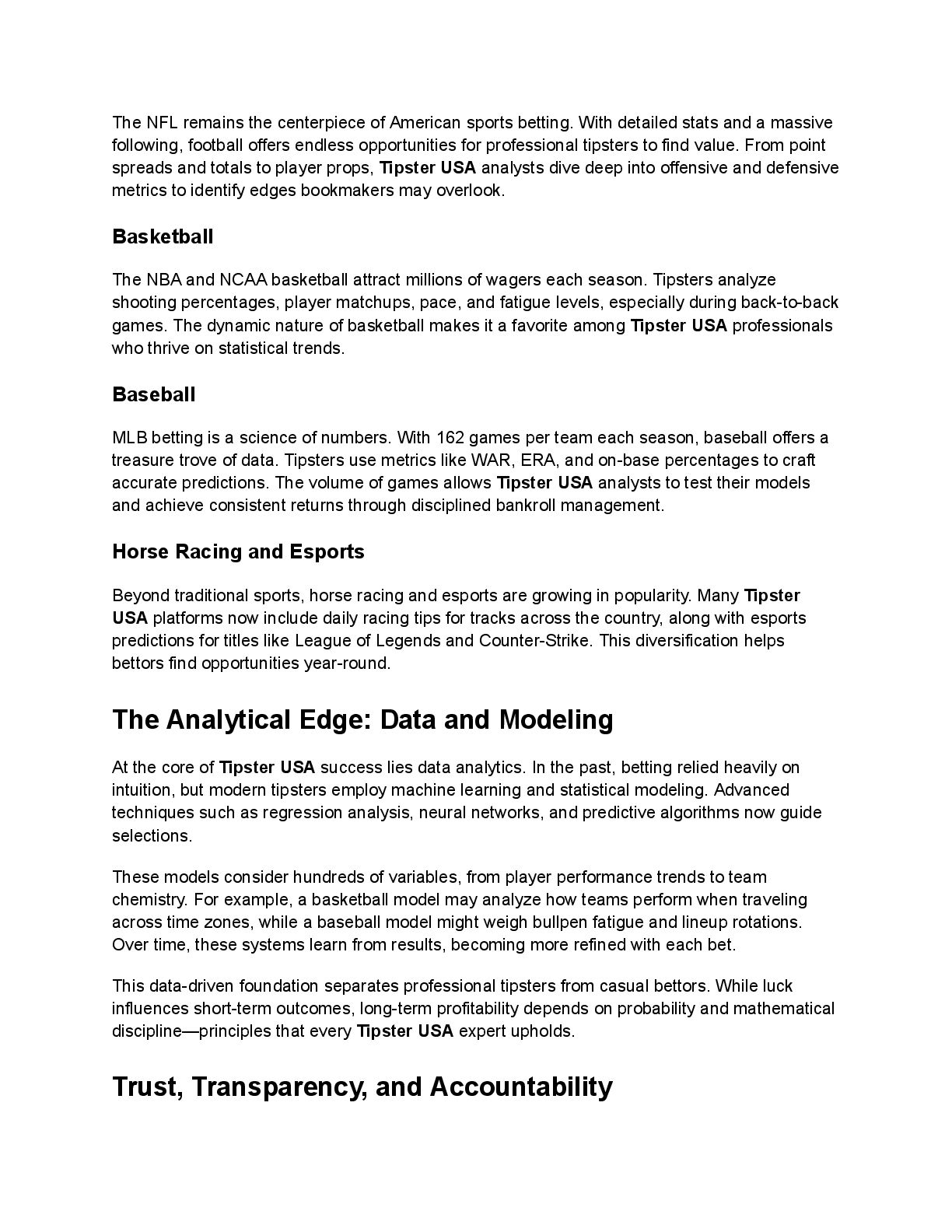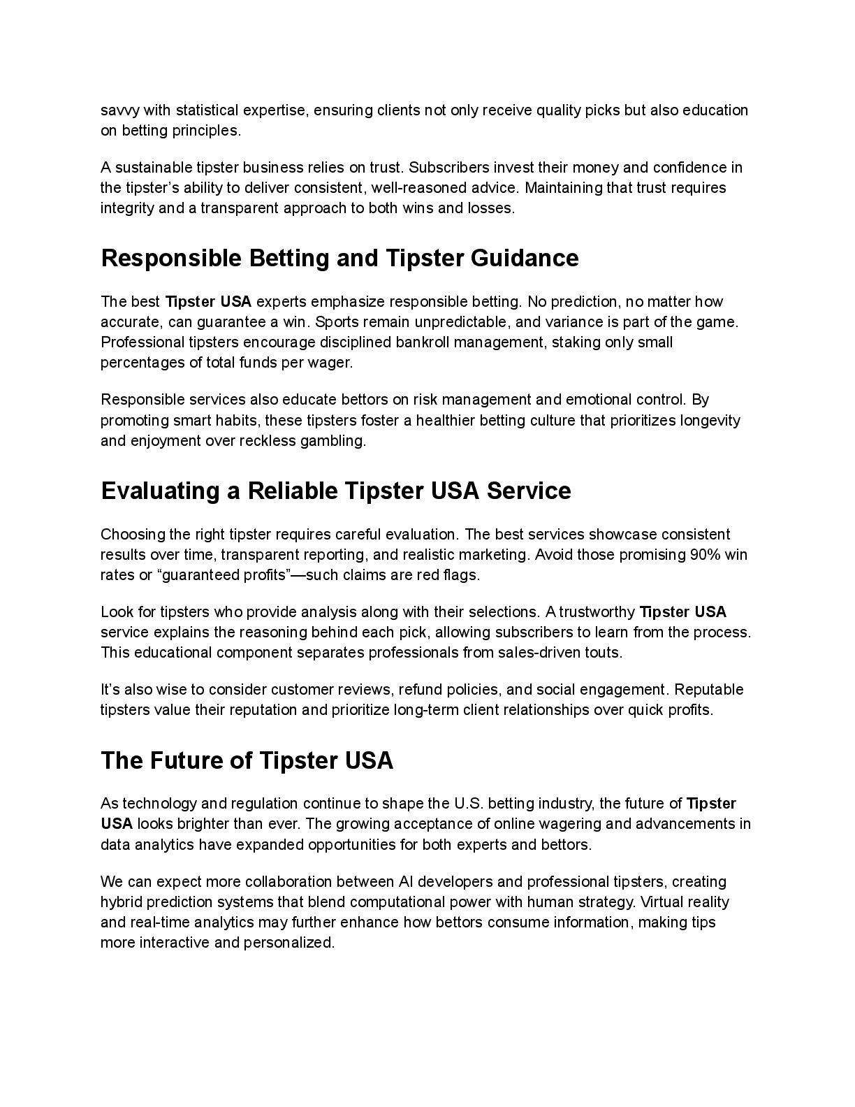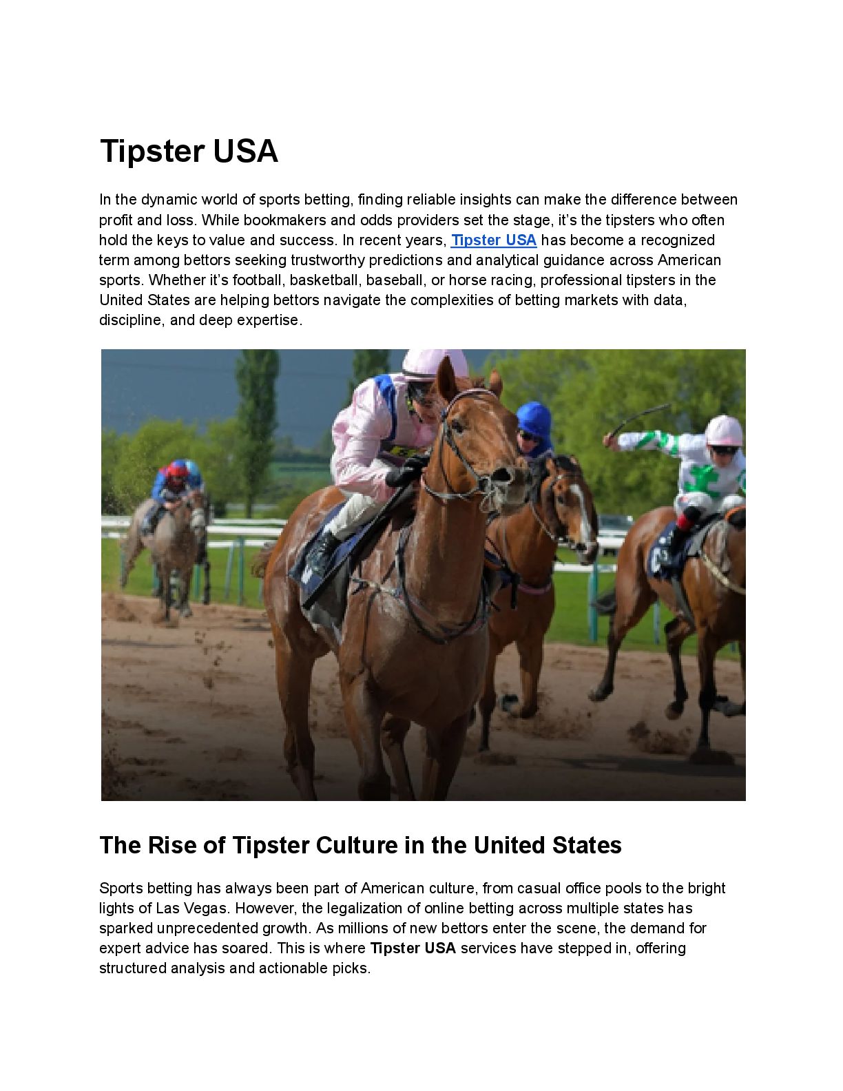the markets, analyzing odds movements, and identifying value. While European tipsters have dominated soccer betting for years, the American betting boom has created a homegrown ecosystem of experts specializing in major U.S. sports like the NFL, NBA, MLB, NHL, and NCAA events. Tipster USA platforms now deliver localized insights tailored to American audiences who demand transparency, accuracy, and consistency. What Defines a True Tipster USA Expert A genuine Tipster USA professional isn’t someone who throws out random picks. Instead, they’re data analysts, statisticians, and sports enthusiasts who combine their passion with scientific betting models. These experts rely on algorithms, form analysis, and historical databases to craft precise predictions. Transparency is key. Top U.S. tipsters provide documented records of past performance, complete with win rates, average odds, and return on investment. Unlike casual social media influencers, professional tipsters understand that long-term credibility depends on proven results. Their focus isn’t just on calling winners—it’s about finding value bets, where the odds offered by bookmakers are higher than the real probability of success. How Tipster USA Platforms Work The Tipster USA ecosystem includes both individual handicappers and collaborative platforms. Many websites aggregate insights from multiple analysts, giving subscribers a range of picks across different sports and bet types. These platforms typically use subscription models, where users pay for daily, weekly, or monthly access to professional selections. The process starts with data collection. Tipsters analyze team statistics, player injuries, weather conditions, and psychological factors such as motivation or fatigue. This information feeds into predictive models that estimate likely outcomes. Once a tip is finalized, it’s shared with subscribers before major line movements occur, ensuring they get optimal odds. Some platforms also use AI tools to refine their predictions. The combination of human insight and machine learning has made Tipster USA services more accurate than ever before, with algorithms capable of identifying undervalued lines within seconds of oddsmaker releases. Sports Covered by Tipster USA Experts While the American betting landscape includes countless sports, Tipster USA experts tend to focus on those with the largest betting volumes and most data availability. Football