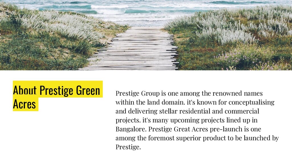 Prestige Great Acres – a residential undertaking from Prestige Group constructions is coming up in prime location of East Bangalore. As everyone is aware, east Bangalore is fast developing and is bundled with major IT parks, good schools, colleges, hospitals, shopping malls etc., thus making it a good choice to own your own flat in this area. Prestige Great Acres offers 1BHK, 2BHK, 2.5 BHK and 3 BHK roomy Plots Sarjapur spread over 10 acres with good amenities.
