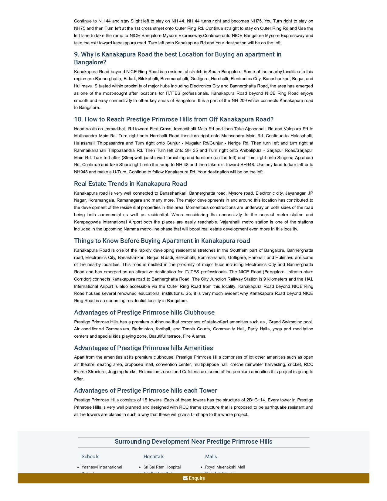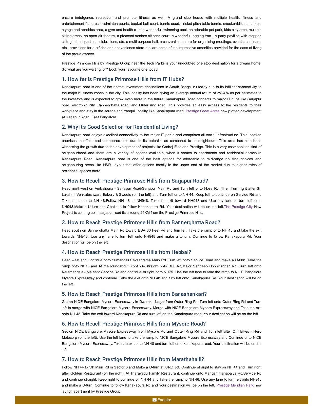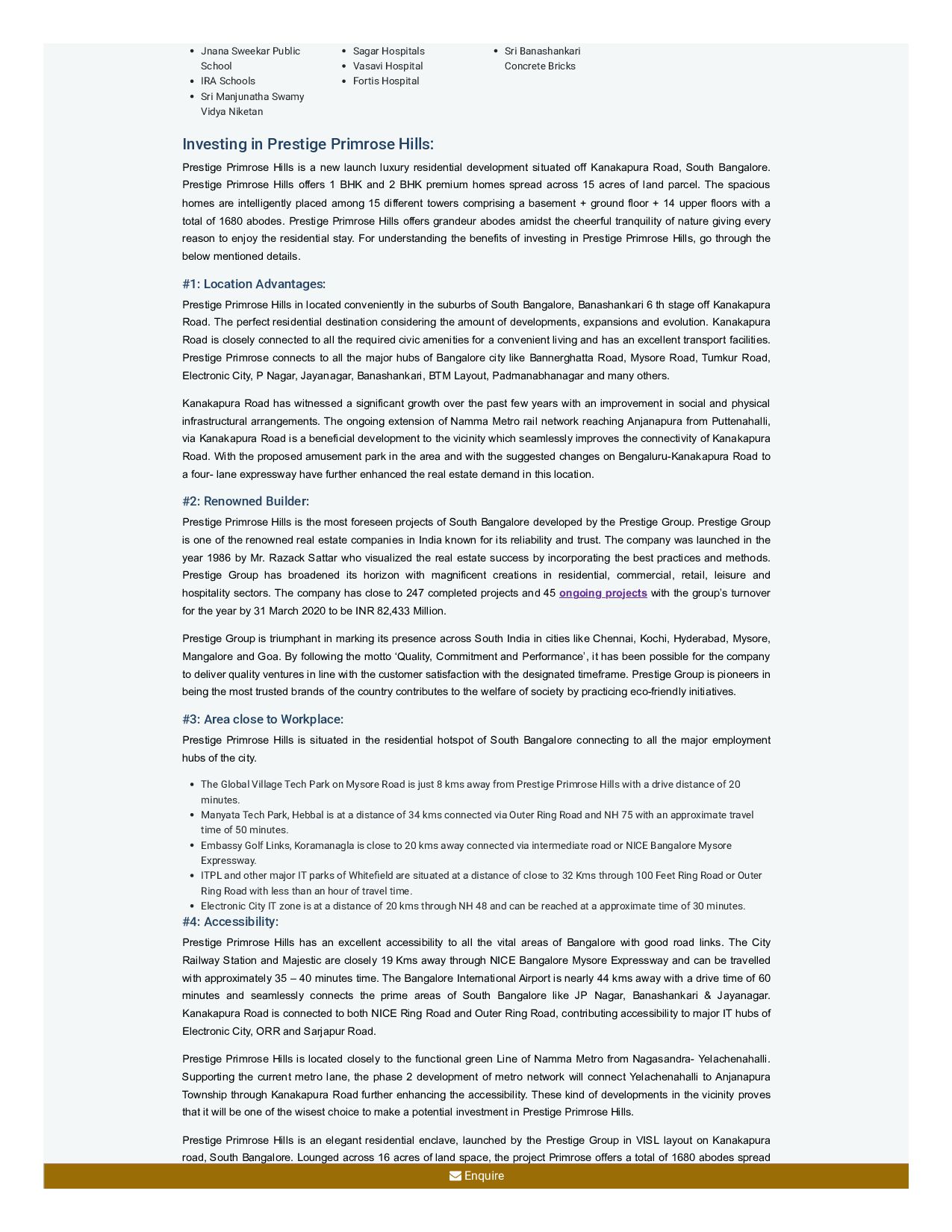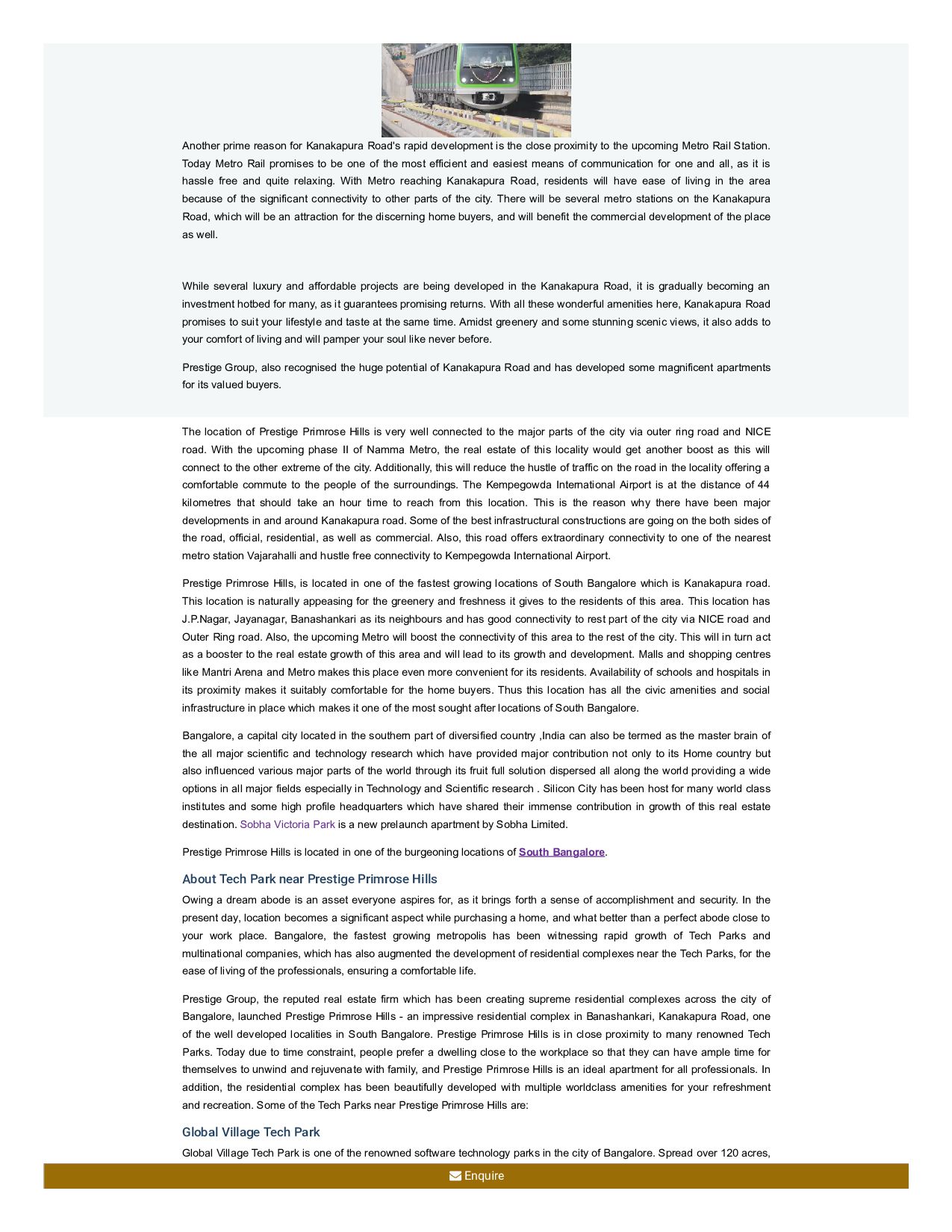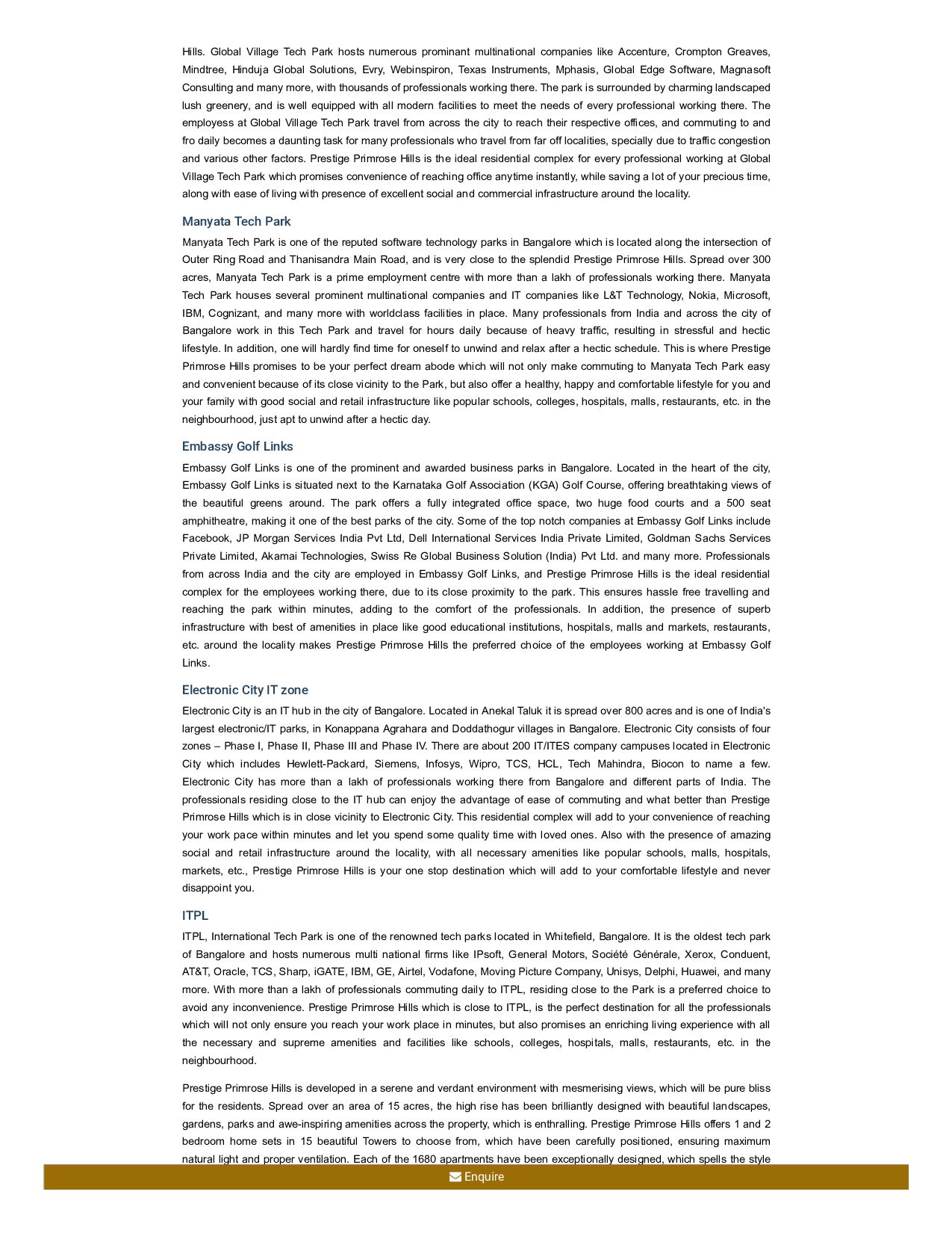 like Accenture, Crompton Greaves, Mindtree, Hinduja Global Solutions, Evry, Webinspiron, Texas Instruments, Mphasis, Global Edge Software, Magnasoft Consulting and many more, with thousands of professionals working there. The park is surrounded by charming landscaped lush greenery, and is well equipped with all modern facilities to meet the needs of every professional working there. The employess at Global Village Tech Park travel from across the city to reach their respective offices, and commuting to and fro daily becomes a daunting task for many professionals who travel from far off localities, specially due to traffic congestion and various other factors. Prestige Primrose Hills is the ideal residential complex for every professional working at Global Village Tech Park which promises convenience of reaching office anytime instantly, while saving a lot of your precious time, along with ease of living with presence of excellent social and commercial infrastructure around the locality. Manyata Tech Park Manyata Tech Park is one of the reputed software technology parks in Bangalore which is located along the intersection of Outer Ring Road and Thanisandra Main Road, and is very close to the splendid Prestige Primrose Hills. Spread over 300 acres, Manyata Tech Park is a prime employment centre with more than a lakh of professionals working there. Manyata Tech Park houses several prominent multinational companies and IT companies like L&T Technology, Nokia, Microsoft, IBM, Cognizant, and many more with worldclass facilities in place. Many professionals from India and across the city of Bangalore work in this Tech Park and travel for hours daily because of heavy traffic, resulting in stressful and hectic lifestyle. In addition, one will hardly find time for oneself to unwind and relax after a hectic schedule. This is where Prestige Primrose Hills promises to be your perfect dream abode which will not only make commuting to Manyata Tech Park easy and convenient because of its close vicinity to the Park, but also offer a healthy, happy and comfortable lifestyle for you and your family with good social and retail infrastructure like popular schools, colleges, hospitals, malls, restaurants, etc. in the neighbourhood, just apt to unwind after a hectic day. Embassy Golf Links Embassy Golf Links is one of the prominent and awarded business parks in Bangalore. Located in the heart of the city, Embassy Golf Links is situated next to the Karnataka Golf Association (KGA) Golf Course, offering breathtaking views of the beautiful greens around. The park offers a fully integrated office space, two huge food courts and a 500 seat amphitheatre, making it one of the best parks of the city. Some of the top notch companies at Embassy Golf Links include Facebook, JP Morgan Services India Pvt Ltd, Dell International Services India Private Limited, Goldman Sachs Services Private Limited, Akamai Technologies, Swiss Re Global Business Solution (India) Pvt Ltd. and many more. Professionals from across India and the city are employed in Embassy Golf Links, and Prestige Primrose Hills is the ideal residential complex for the employees working there, due to its close proximity to the park. This ensures hassle free travelling and reaching the park within minutes, adding to the comfort of the professionals. In addition, the presence of superb infrastructure with best of amenities in place like good educational institutions, hospitals, malls and markets, restaurants, etc. around the locality makes Prestige Primrose Hills the preferred choice of the employees working at Embassy Golf Links. Electronic City IT zone Electronic City is an IT hub in the city of Bangalore. Located in Anekal Taluk it is spread over 800 acres and is one of India's largest electronic/IT parks, in Konappana Agrahara and Doddathogur villages in Bangalore. Electronic City consists of four zones – Phase I, Phase II, Phase III and Phase IV. There are about 200 IT/ITES company campuses located in Electronic City which includes Hewlett-Packard, Siemens, Infosys, Wipro, TCS, HCL, Tech Mahindra, Biocon to name a few. Electronic City has more than a lakh of professionals working there from Bangalore and different parts of India. The professionals residing close to the IT hub can enjoy the advantage of ease of commuting and what better than Prestige Primrose Hills which is in close vicinity to Electronic City. This residential complex will add to your convenience of reaching your work pace within minutes and let you spend some quality time with loved ones. Also with the presence of amazing social and retail infrastructure around the locality, with all necessary amenities like popular schools, malls, hospitals, markets, etc., Prestige Primrose Hills is your one stop destination which will add to your comfortable lifestyle and never disappoint you. ITPL ITPL, International Tech Park is one of the renowned tech parks located in Whitefield, Bangalore. It is the oldest tech park of Bangalore and hosts numerous multi national firms like IPsoft, General Motors, Société Générale, Xerox, Conduent, AT&T, Oracle, TCS, Sharp, iGATE, IBM, GE, Airtel, Vodafone, Moving Picture Company, Unisys, Delphi, Huawei, and many more. With more than a lakh of professionals commuting daily to ITPL, residing close to the Park is a preferred choice to avoid any inconvenience. Prestige Primrose Hills which is close to ITPL, is the perfect destination for all the professionals which will not only ensure you reach your work place in minutes, but also promises an enriching living experience with all the necessary and supreme amenities and facilities like schools, colleges, hospitals, malls, restaurants, etc. in the neighbourhood. Prestige Primrose Hills is developed in a serene and verdant environment with mesmerising views, which will be pure bliss for the residents. Spread over an area of 15 acres, the high rise has been brilliantly designed with beautiful landscapes, gardens, parks