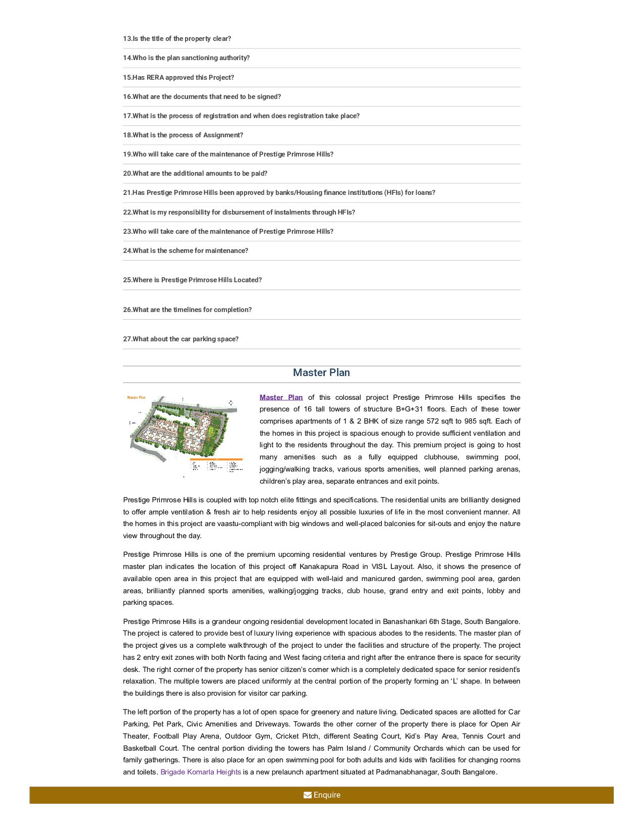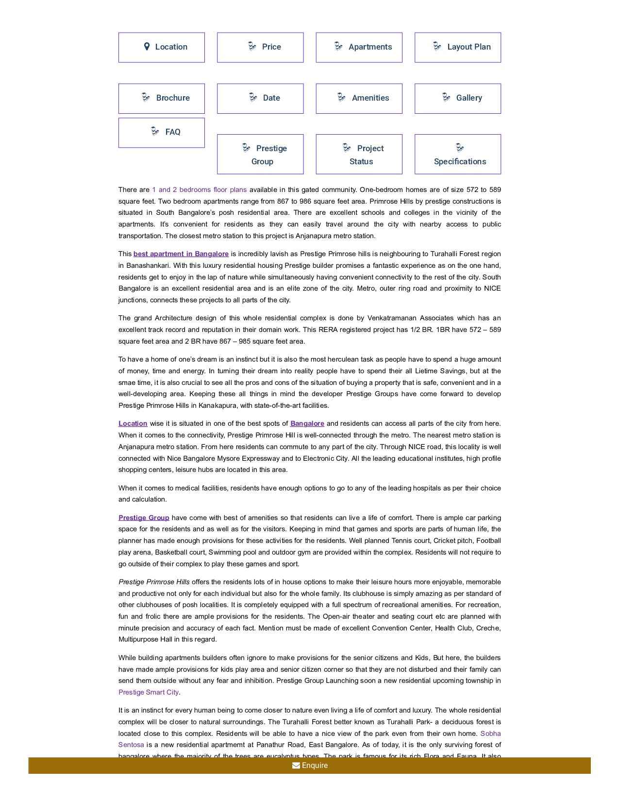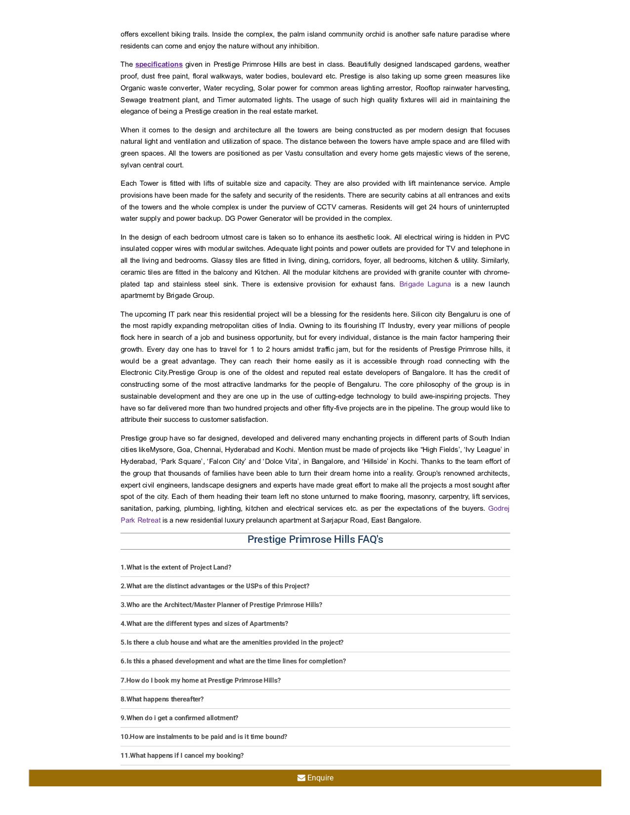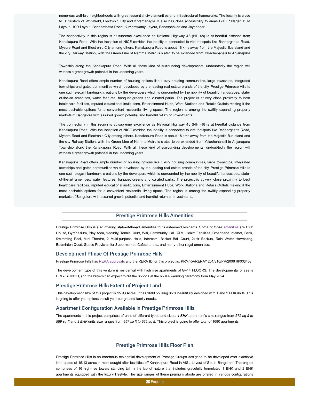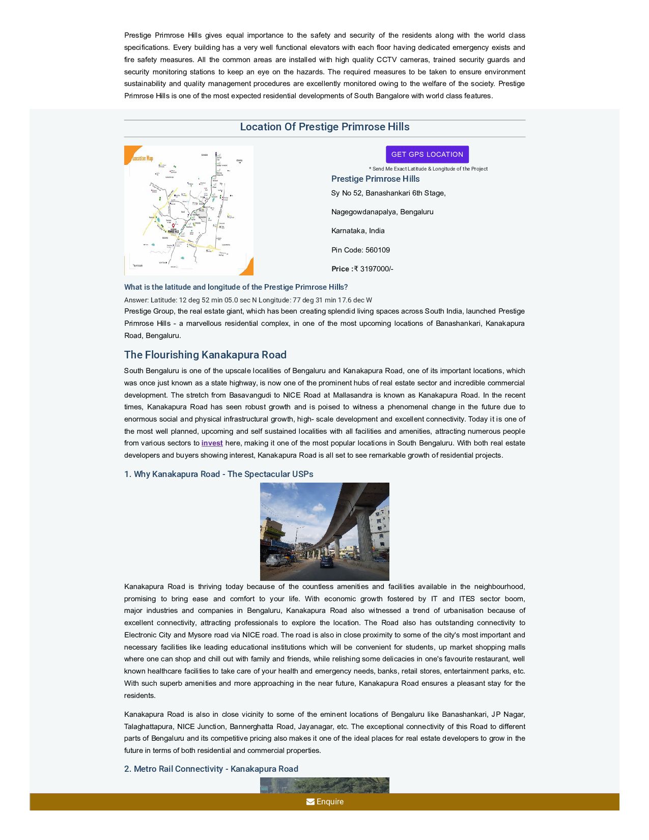 like Accenture, Crompton Greaves, Mindtree, Hinduja Global Solutions, Evry, Webinspiron, Texas Instruments, Mphasis, Global Edge Software, Magnasoft Consulting and many more, with thousands of professionals working there. The park is surrounded by charming landscaped lush greenery, and is well equipped with all modern facilities to meet the needs of every professional working there. The employess at Global Village Tech Park travel from across the city to reach their respective offices, and commuting to and fro daily becomes a daunting task for many professionals who travel from far off localities, specially due to traffic congestion and various other factors. Prestige Primrose Hills is the ideal residential complex for every professional working at Global Village Tech Park which promises convenience of reaching office anytime instantly, while saving a lot of your precious time, along with ease of living with presence of excellent social and commercial infrastructure around the locality. Manyata Tech Park Manyata Tech Park is one of the reputed software technology parks in Bangalore which is located along the intersection of Outer Ring Road and Thanisandra Main Road, and is very close to the splendid Prestige Primrose Hills. Spread over 300 acres, Manyata Tech Park is a prime employment centre with more than a lakh of professionals working there. Manyata Tech Park houses several prominent multinational companies and IT companies like L&T Technology, Nokia, Microsoft, IBM, Cognizant, and many more with worldclass facilities in place. Many professionals from India and across the city of Bangalore work in this Tech Park and travel for hours daily because of heavy traffic, resulting in stressful and hectic lifestyle. In addition, one will hardly find time for oneself to unwind and relax after a hectic schedule. This is where Prestige Primrose Hills promises to be your perfect dream abode which will not only make commuting to Manyata Tech Park easy and convenient because of its close vicinity to the Park, but also offer a healthy, happy and comfortable lifestyle for you and your family with good social and retail infrastructure like popular schools, colleges, hospitals, malls, restaurants, etc. in the neighbourhood, just apt to unwind after a hectic day. Embassy Golf Links Embassy Golf Links is one of the prominent and awarded business parks in Bangalore. Located in the heart of the city, Embassy Golf Links is situated next to the Karnataka Golf Association (KGA) Golf Course, offering breathtaking views of the beautiful greens around. The park offers a fully integrated office space, two huge food courts and a 500 seat amphitheatre, making it one of the best parks of the city. Some of the top notch companies at Embassy Golf Links include Facebook, JP Morgan Services India Pvt Ltd, Dell International Services India Private Limited, Goldman Sachs Services Private Limited, Akamai Technologies, Swiss Re Global Business Solution (India) Pvt Ltd. and many more. Professionals from across India and the city are employed in Embassy Golf Links, and Prestige Primrose Hills is the ideal residential complex for the employees working there, due to its close proximity to the park. This ensures hassle free travelling and reaching the park within minutes, adding to the comfort of the professionals. In addition, the presence of superb infrastructure with best of amenities in place like good educational institutions, hospitals, malls and markets, restaurants, etc. around the locality makes Prestige Primrose Hills the preferred choice of the employees working at Embassy Golf Links. Electronic City IT zone Electronic City is an IT hub in the city of Bangalore. Located in Anekal Taluk it is spread over 800 acres and is one of India's largest electronic/IT parks, in Konappana Agrahara and Doddathogur villages in Bangalore. Electronic City consists of four zones – Phase I, Phase II, Phase III and Phase IV. There are about 200 IT/ITES company campuses located in Electronic City which includes Hewlett-Packard, Siemens, Infosys, Wipro, TCS, HCL, Tech Mahindra, Biocon to name a few. Electronic City has more than a lakh of professionals working there from Bangalore and different parts of India. The professionals residing close to the IT hub can enjoy the advantage of ease of commuting and what better than Prestige Primrose Hills which is in close vicinity to Electronic City. This residential complex will add to your convenience of reaching your work pace within minutes and let you spend some quality time with loved ones. Also with the presence of amazing social and retail infrastructure around the locality, with all necessary amenities like popular schools, malls, hospitals, markets, etc., Prestige Primrose Hills is your one stop destination which will add to your comfortable lifestyle and never disappoint you. ITPL ITPL, International Tech Park is one of the renowned tech parks located in Whitefield, Bangalore. It is the oldest tech park of Bangalore and hosts numerous multi national firms like IPsoft, General Motors, Société Générale, Xerox, Conduent, AT&T, Oracle, TCS, Sharp, iGATE, IBM, GE, Airtel, Vodafone, Moving Picture Company, Unisys, Delphi, Huawei, and many more. With more than a lakh of professionals commuting daily to ITPL, residing close to the Park is a preferred choice to avoid any inconvenience. Prestige Primrose Hills which is close to ITPL, is the perfect destination for all the professionals which will not only ensure you reach your work place in minutes, but also promises an enriching living experience with all the necessary and supreme amenities and facilities like schools, colleges, hospitals, malls, restaurants, etc. in the neighbourhood. Prestige Primrose Hills is developed in a serene and verdant environment with mesmerising views, which will be pure bliss for the residents. Spread over an area of 15 acres, the high rise has been brilliantly designed with beautiful landscapes, gardens, parks