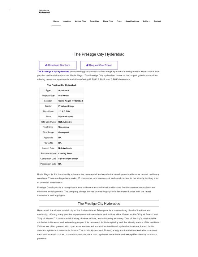 historical monuments, including the Charminar and Golconda Fort, showcase the architectural brilliance of the bygone era. The city's modern skyline is equally impressive, with towering skyscrapers, IT parks, and research institutions that have earned it the moniker "Cyberabad." It has several prestigious educational institutions and research centers, making it a hub for innovation and knowledge. The city's economy has witnessed remarkable growth, with thriving industries in information technology, pharmaceuticals, and manufacturing. This economic prosperity has not only brought innumerable job opportunities but has also led to a better standard of living for its residents. Hyderabad's vibrant arts and culture scene thrives in its theaters, museums, and art galleries, celebrating the rich heritage of dance, music, and literature. The annual Hyderabad International Film Festival, showcasing world cinema, is a testament to its cultural diversity. In addition to its cultural richness and economic vitality, Hyderabad's lush parks, gardens, and serene lakes provide residents with green spaces to unwind and rejuvenate. The pleasant weather throughout the year is another blessing, making outdoor activities enjoyable year-round. Hyderabad is a city that seamlessly fuses its glorious past with its promising future. With its rich culture, delectable cuisine, economic opportunities, and warm-hearted people, it is a shining example of the positive aspects of urban life in India. If you want to buy a property in Hyderabad, visit The Prestige City Hyderabad. It is a new mixed development project by the Prestige group in Hyderabad. The project will offer you the home of your dreams. Shamshabad Shamshabad is a significant locality in the southern part of Hyderabad, Telangana, India. Once a suburban region, this area has witnessed substantial development and growth over the years, making it a noteworthy and positive aspect of Hyderabad's expansion. One of the standout features of this area is its connectivity. It houses the Rajiv Gandhi International Airport, one of India's busiest and most well- maintained airports. This world-class airport facilitates seamless domestic and international travel and contributes to the region's economic development by promoting tourism and trade. Shamshabad's strategic location, with its proximity to the airport and major highways, has attracted various industries and businesses. As a result, the area has seen commercial hubs, industrial estates, and logistics centers emerge. This economic development has translated into increased employment opportunities, driving economic prosperity in the region. Moreover, it has become a focal point for various infrastructural developments. The Outer Ring Road (ORR), a significant transportation corridor in Hyderabad, passes through this area. This has not only improved connectivity within the city but has also led to the establishment of residential communities, educational institutions, and healthcare facilities. Residents of this area benefit from a growing number of educational institutions, making it an appealing place for families. Additionally, the locality's proximity to nature spots like Himayat Sagar and Shamirpet Lake provides residents with opportunities for leisure and relaxation. In recent years, it has seen an increase in residential real estate development, offering a range of housing options to match various preferences and budgets. This growth in housing options, combined with the area's overall infrastructure development, has made Shamshabad an attractive destination for homebuyers and investors. Shamshabad is a thriving locality in Hyderabad that has evolved into an essential part of the city's landscape. Its excellent connectivity, economic opportunities, educational institutions, and quality of life make it a positive and desirable place to live and work in the bustling city of Hyderabad. If you want to buy a property in Shamshabad, visit Prestige City Shamshabad. It is one of the biggest projects in Hyderabad. Budvel Budvel is a suburban locality in the southern part of Hyderabad, Telangana, India. While it may not be as widely recognized as some other parts of the city, it has several positive aspects that make it an appealing place to live and visit. One of the notable features of this area is its serene and relatively quiet environment. It offers a peaceful respite from the stress of the city, making it an ideal choice for those who prefer a more relaxed lifestyle. The area is characterized by tree-lined streets and green spaces, contributing to its tranquil ambiance. Budvel's strategic location is another advantage. It enjoys easy access to the Outer Ring Road (ORR), which connects it to other parts of Hyderabad. This connectivity has made it a convenient choice for commuters who work in different parts of the city, as they can enjoy a relatively smoother and shorter commute. The neighborhood also boasts a sense of community and a strong local culture. Residents often come together to celebrate festivals and organize community events, fostering a sense of belonging and camaraderie. This close-knit atmosphere can be especially appealing for those seeking a tight-knit community.