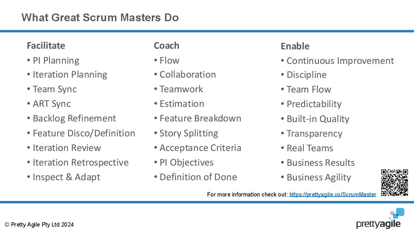 The presentation outlined the activities and coaching focus of effective Scrum Masters, highlighted the importance of Scrum Master and Product Owner collaboration, and pointed to the need for leaders to stay focused on value. It referenced simple decision funnels, the role of exit policies, and areas where DevOps investment contributes to improving supply, including environments, pipelines, configuration, data, and AI.
