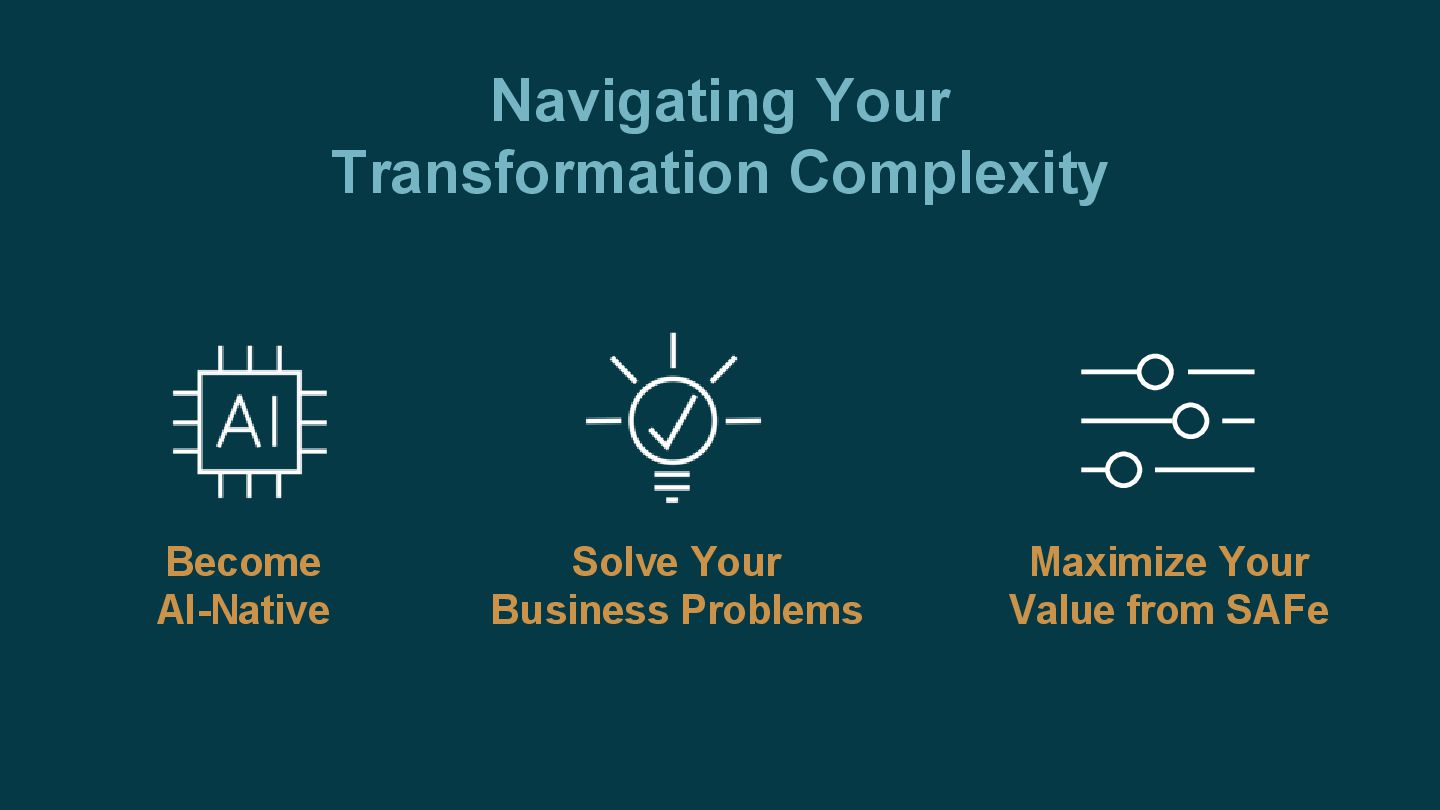 A brief example from digital health was used to show how AI can reduce cycle times when supported by the right technical capabilities. The session closed with prompts for leaders to maximise their value from SAFe, navigate transformation complexity, and consider how AI-native ways of working support value delivery.