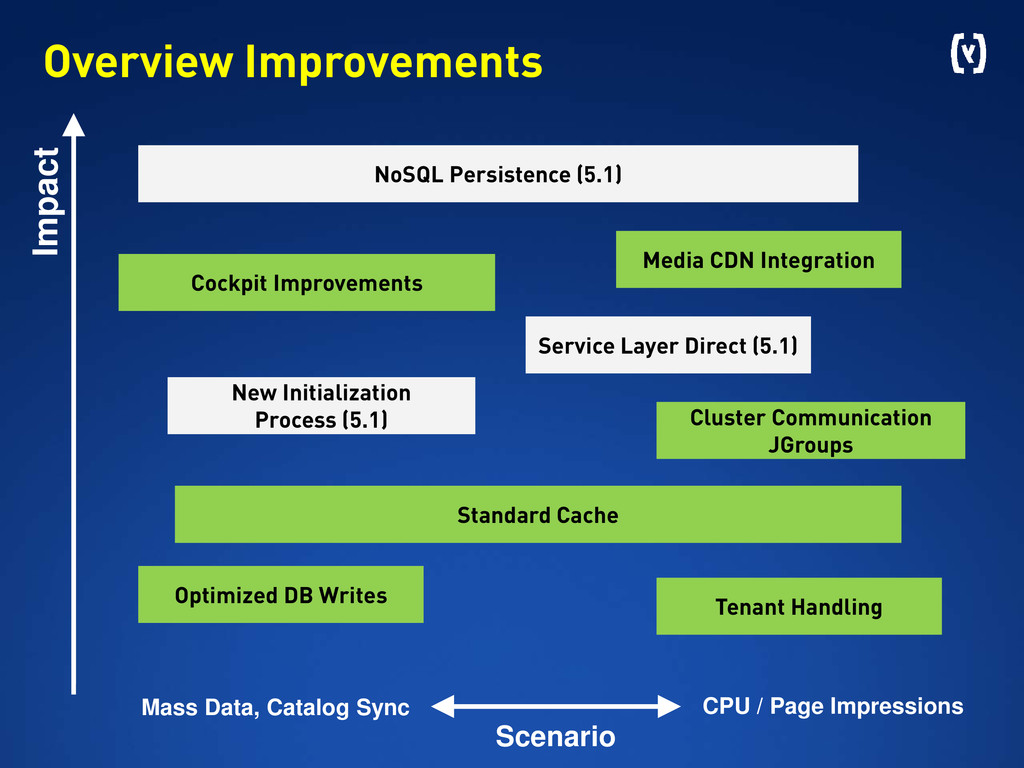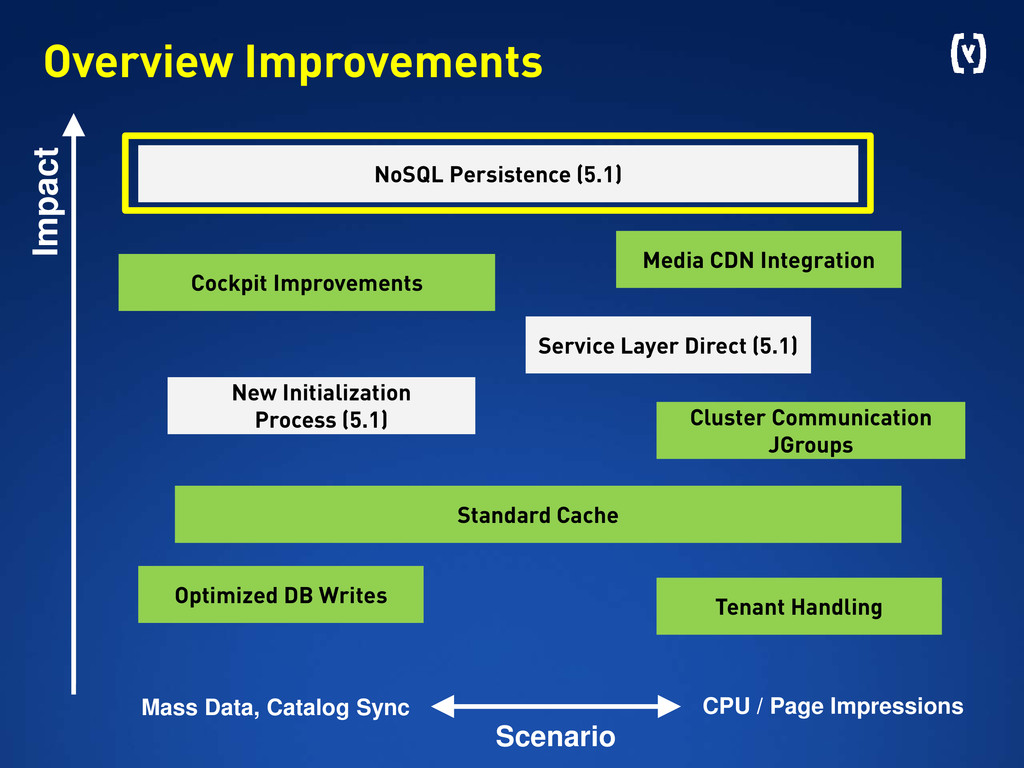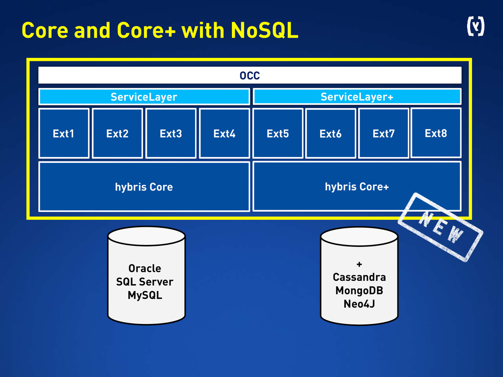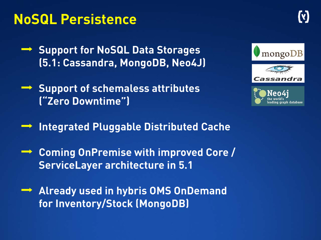 MongoDB, Neo4J) ➡ Support of schemaless attributes (“Zero Downtime”) ➡ Integrated Pluggable Distributed Cache ➡ Coming OnPremise with improved Core / ServiceLayer architecture in 5.1 ➡ Already used in hybris OMS OnDemand for Inventory/Stock (MongoDB)
