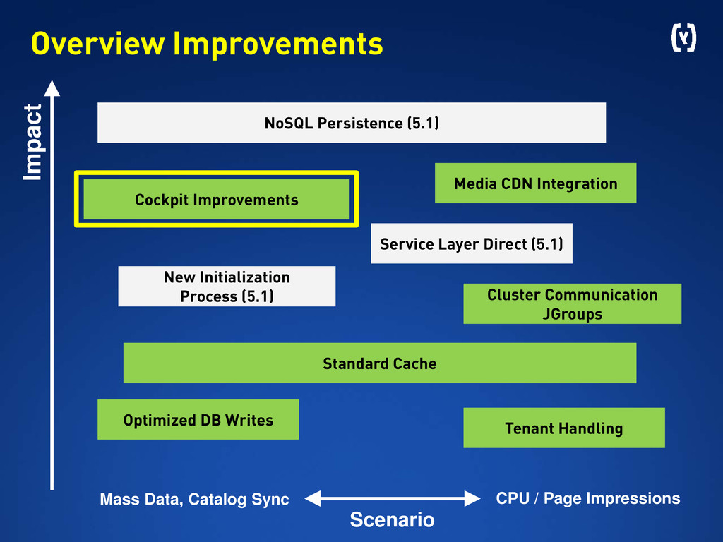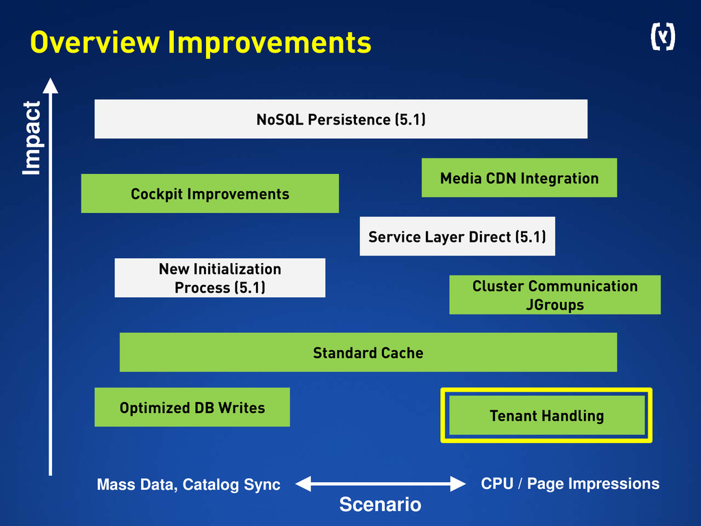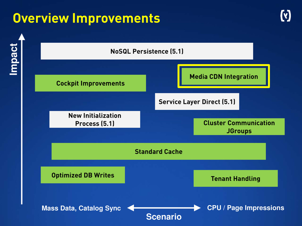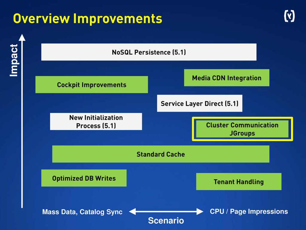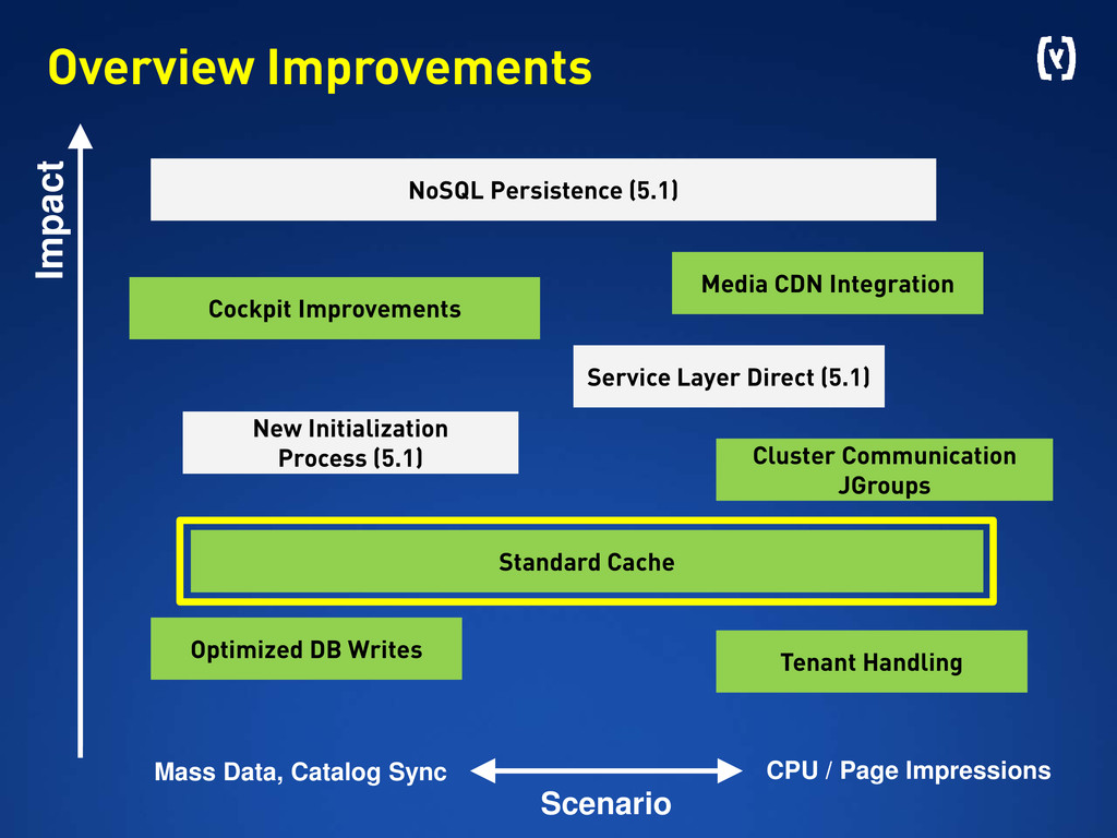 MongoDB, Neo4J) ➡ Support of schemaless attributes (“Zero Downtime”) ➡ Integrated Pluggable Distributed Cache ➡ Coming OnPremise with improved Core / ServiceLayer architecture in 5.1 ➡ Already used in hybris OMS OnDemand for Inventory/Stock (MongoDB)