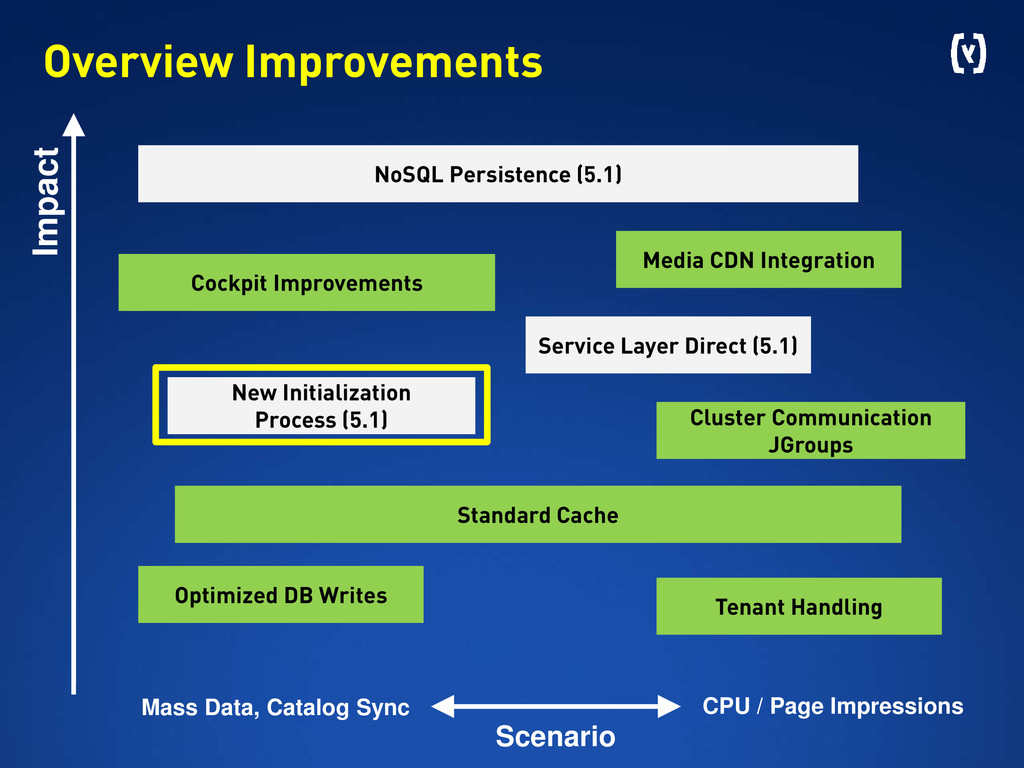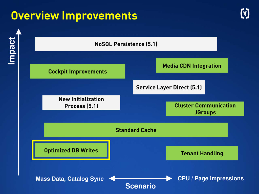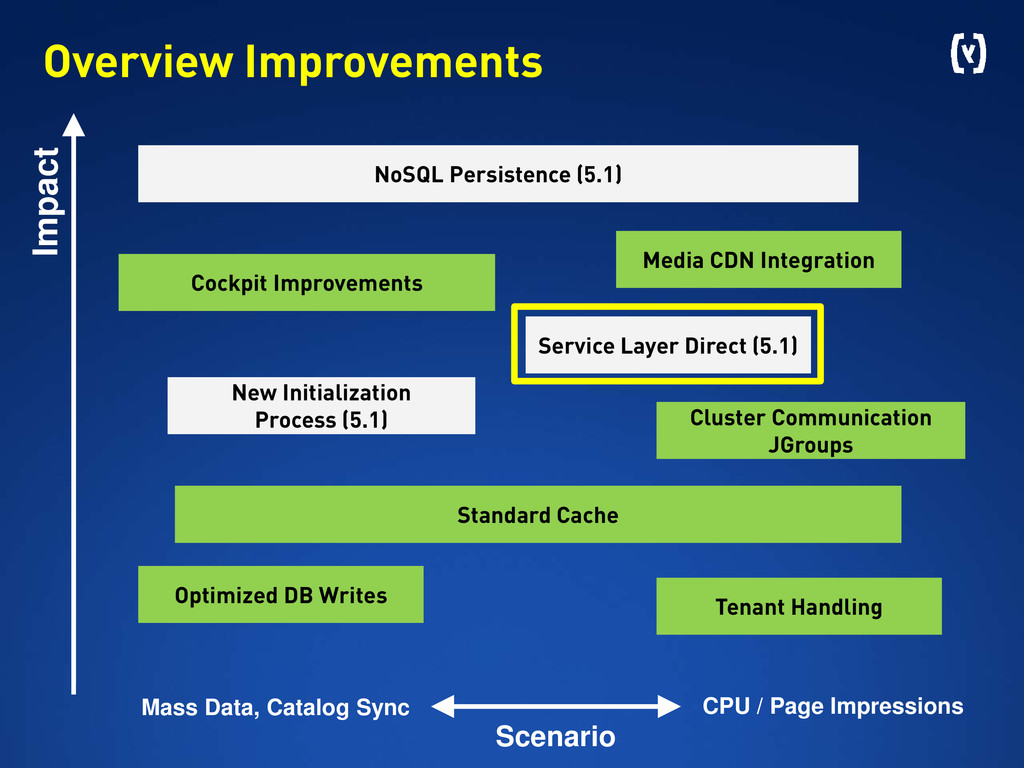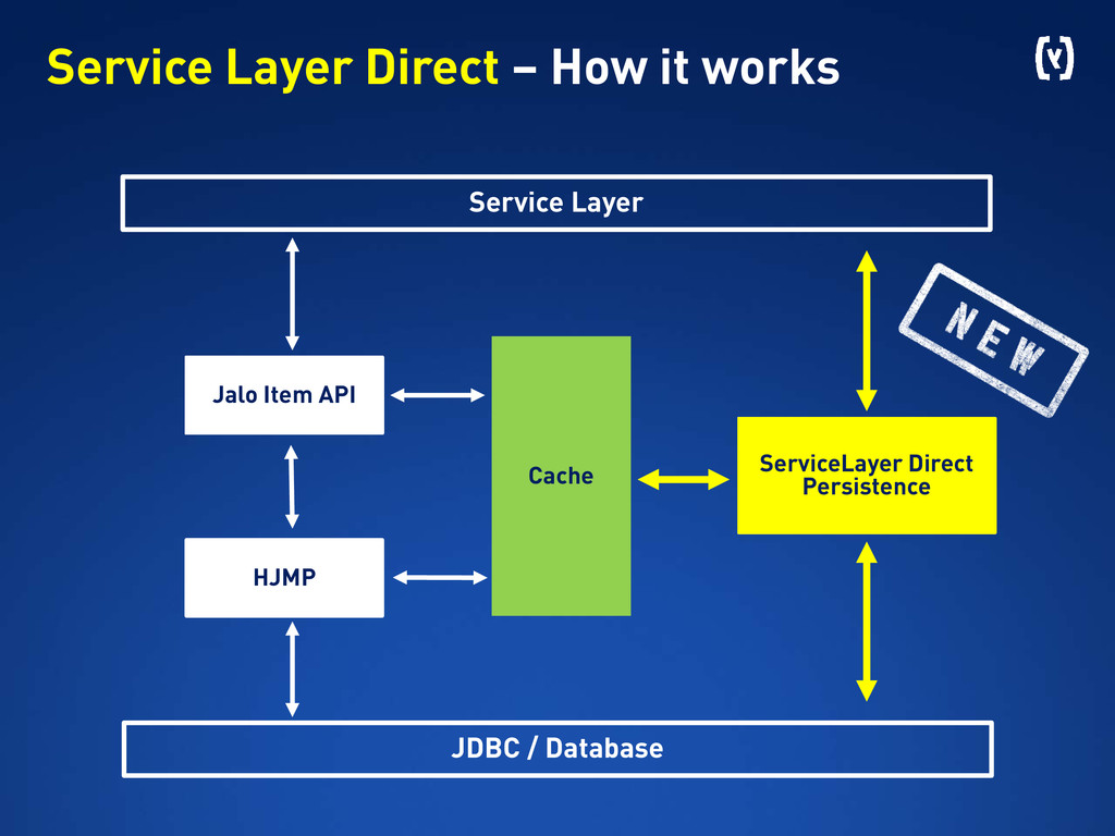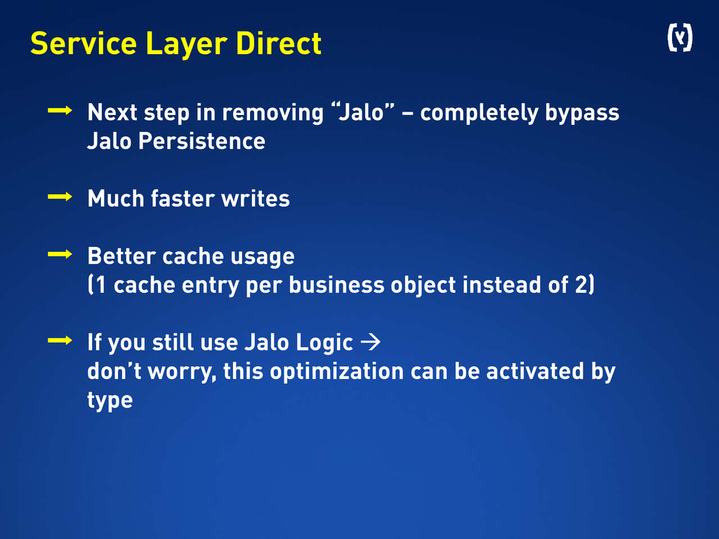 Persistence ➡ Much faster writes ➡ Better cache usage (1 cache entry per business object instead of 2) ➡ If you still use Jalo Logic don’t worry, this optimization can be activated by type Service Layer Direct