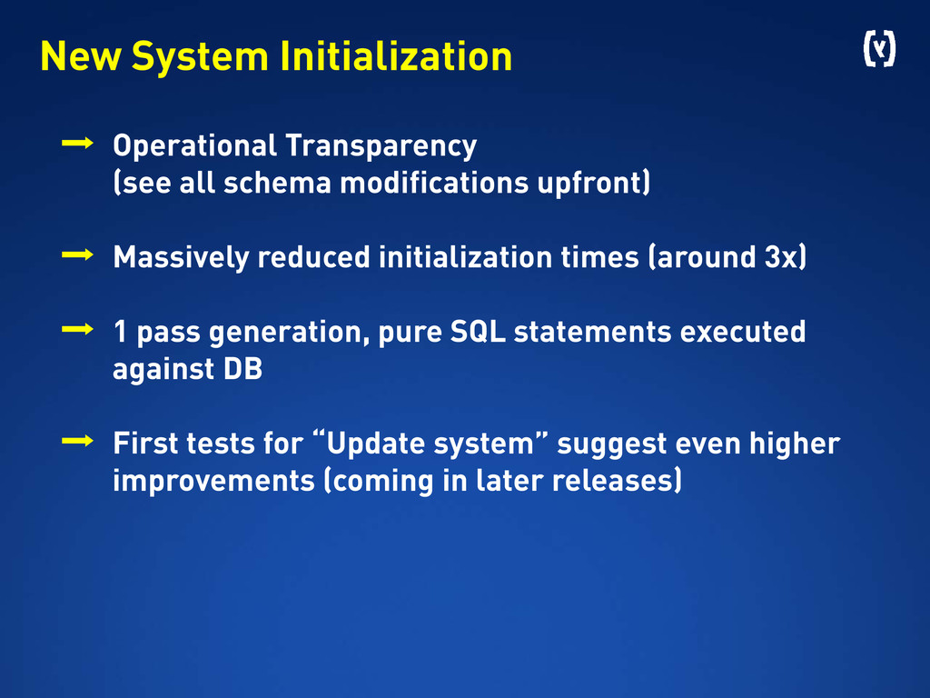 reduced initialization times (around 3x) ➡ 1 pass generation, pure SQL statements executed against DB ➡ First tests for “Update system” suggest even higher improvements (coming in later releases) New System Initialization