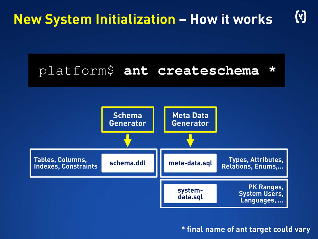 PK Ranges, System Users, Languages, ... Schema Generator schema.ddl Tables, Columns, Indexes, Constraints platform$ ant createschema * New System Initialization – How it works * final name of ant target could vary