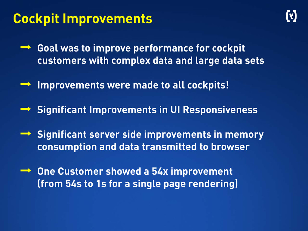customers with complex data and large data sets ➡ Improvements were made to all cockpits! ➡ Significant Improvements in UI Responsiveness ➡ Significant server side improvements in memory consumption and data transmitted to browser ➡ One Customer showed a 54x improvement (from 54s to 1s for a single page rendering)