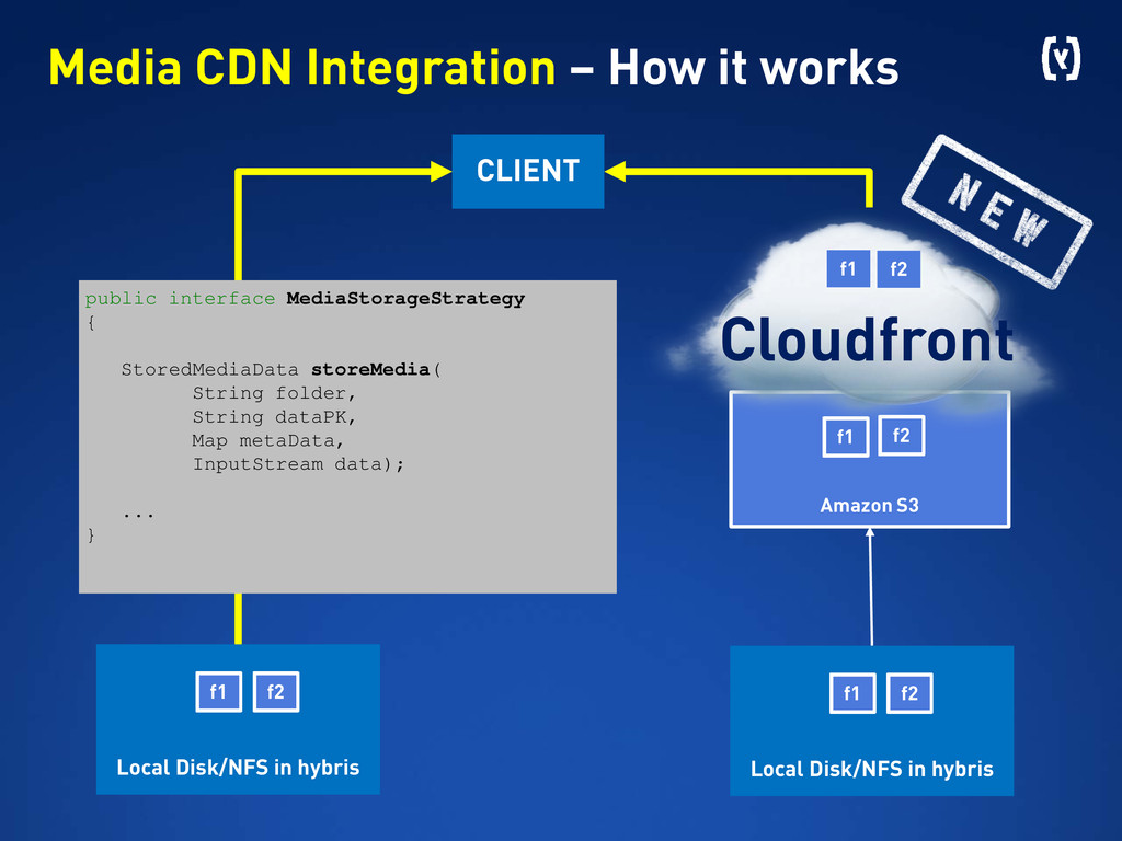 in hybris f1 f2 Amazon S3 f1 f2 Cloudfront f1 f2 Local Disk/NFS in hybris f1 f2 public interface MediaStorageStrategy { StoredMediaData storeMedia( String folder, String dataPK, Map metaData, InputStream data); ... }