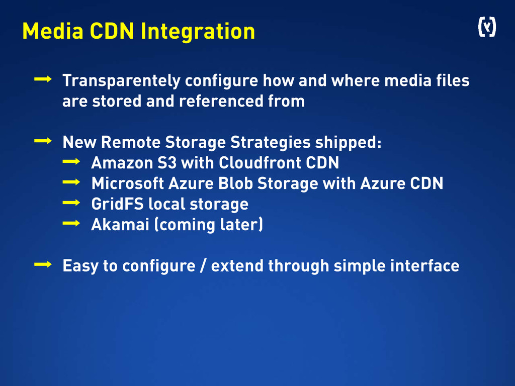 files are stored and referenced from ➡ New Remote Storage Strategies shipped: ➡ Amazon S3 with Cloudfront CDN ➡ Microsoft Azure Blob Storage with Azure CDN ➡ GridFS local storage ➡ Akamai (coming later) ➡ Easy to configure / extend through simple interface