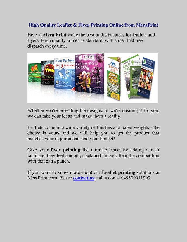 at Mera Print we're the best in the business for leaflets and flyers. High quality comes as standard, with super-fast free dispatch every time. Whether you're providing the designs, or we're creating it for you, we can take your ideas and make them a reality. Leaflets come in a wide variety of finishes and paper weights - the choice is yours and we will help you to get the product that matches your requirements and your budget! Give your flyer printing the ultimate finish by adding a matt laminate, they feel smooth, sleek and thicker. Beat the competition with that extra punch. If you want to know more about our Leaflet printing solutions at MeraPrint.com. Please contact us, call us on +91-9509911999