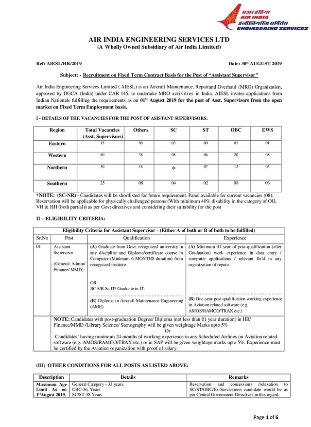 will be engaged on fixed-terms contract basis for a period of 05 years. The contract may be terminated at the discretion of the Management during the tenure of the contract and / or in the event of unsatisfactory performance. e) The contract is extendable for further term of 5 years depending upon satisfactory performance of the candidate and requirement of the company. f) Candidates engaged on fixed-terms contract basis will be entitled for Provident Fund, Gratuity, and ESI, if applicable, as per policy of the company. g) The candidates will have to make their own arrangement for housing accommodation at the place of posting. h) The Company, at its discretion, may assign additional duties, as and when required. i) SC/ST candidates who reporting for Written Examination / Skill Test and residing beyond 80 km from the venue of the test and not employed in any Government, Semi-Government/Public Sector Undertakings or Autonomous Bodies, will be reimbursed second class to & fro rail/ bus fare by the shortest route as per rules, on production of document of travel. Candidates are also advised to submit self-Account cancelled cheque / copy of self-account cheque along with fare reimbursement form on the day of skill Test. j) Candidates must ensure that they fulfill all the laid down procedure eligibility criteria, prescribed for the post before submission of online application. k) At any stage of the selection process and even after appointment, if it is found that the particulars furnished by the candidate in the Application Form or testimonials are incorrect/false or the candidate does not meet the Eligibility Criteria Prescribed for the post, or has suppressed any material fact(s), his/her application / appointment shall be summarily rejected / cancelled without making any further reference. l) Any canvassing by or on behalf of the candidate or bringing in any outside influence with regard to the selection of the candidate shall be considered as a DISQUALIFICATION. Candidates are advised to go through the following instructions before applying a) A recent (not more than three months old) colored passport-size photograph of the full face (front view) should be uploaded while filling online application. b) The candidates belonging to OBC categories, at the time of documentation/ verification process, must submit a self –attested photocopy of the Non-Creamy Layer Certificate, recently issued by the Competent Authority in the format as prescribed by Govt. of India. The Certificate, inter alia, must specifically state that the candidate does not belong to socially advanced sections excluded from the benefits of reservations for OBC in civil posts and services under the Government of India. The Certificate should also contain the “Non-Creamy Layer” Clause. The Certificate produced by the candidates of OBC community should be as per the Central List published by the Government of India and not as per the State Lists. c) Applicants ordinarily domiciled in Kashmir Division of J & K State during 01.01.1980 to 31.12.1989 who are eligible for the upper age relaxation, must produce the Domicile Certificate to this effect at the time of Interview from the District Magistrate in the Kashmir Division, with whose jurisdiction the applicant had ordinarily resided or any other authority designated in this regard by the Government of Jammu & Kashmir. d) The applicant should ensure that they fulfill all the eligibility criteria as on 1st August 2019. Other particulars furnished should be correct in all respects. At any stage of the Selection Process, if the particulars provided by the candidates in the application or testimonials supplied are found incorrect/false, or not meeting with the eligibility requirements prescribed for the posts, the candidatures is liable to be rejected and, if engaged, services terminated, without giving any notice or reasons therefore. e) Self-attested clear copies of the supportive documents in respect of Educational Qualification, experience in the relevant field etc. must be brought along whenever called for pre joining documentation/ verification process. Self –Attested photocopy of the Caste Certificate should also be brought in case of SC/ST/OBC candidates and income and assets certificate issued by competent authority for EWS candidates. f) All related original certificates are required to be brought, at the time of documentation/ pre joining formalities for verification purpose. g) Applicants working in Government/Semi-Government/Public Sector Undertakings or autonomous bodies must bring ‘No Objection Certificate” from their present employer. Dy. Gen. Manager (P) For Chief of Personnel, AIESL
