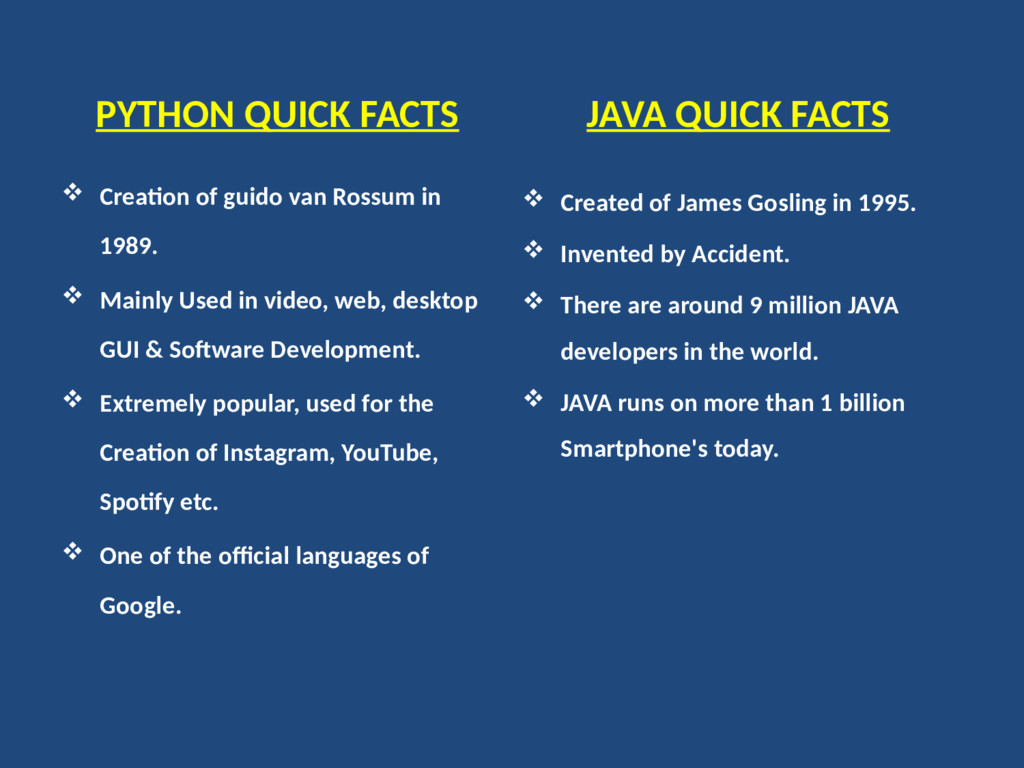 1989. Mainly Used in video, web, desktop GUI & Software Development. Extremely popular, used for the Creation of Instagram, YouTube, Spotify etc. One of the official languages of Google. JAVA QUICK FACTS Created of James Gosling in 1995. Invented by Accident. There are around 9 million JAVA developers in the world. JAVA runs on more than 1 billion Smartphone's today.