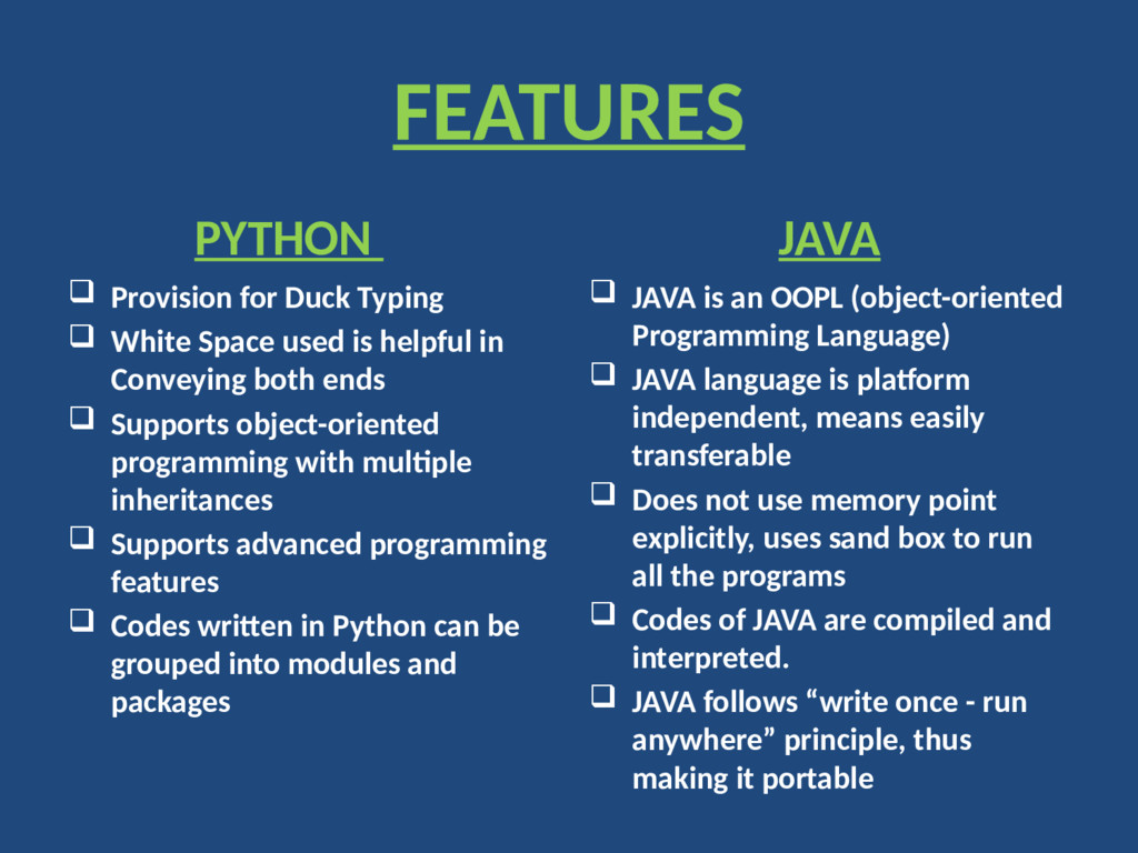 used is helpful in Conveying both ends Supports object-oriented programming with multiple inheritances Supports advanced programming features Codes written in Python can be grouped into modules and packages JAVA JAVA is an OOPL (object-oriented Programming Language) JAVA language is platform independent, means easily transferable Does not use memory point explicitly, uses sand box to run all the programs Codes of JAVA are compiled and interpreted. JAVA follows “write once - run anywhere” principle, thus making it portable