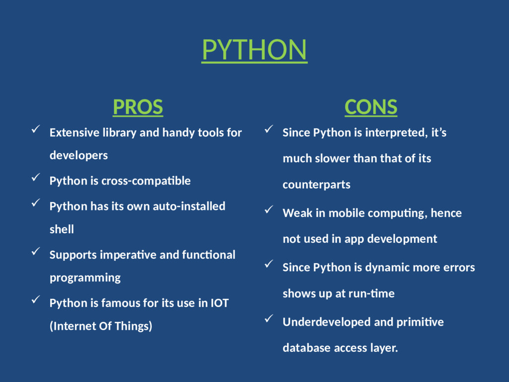 Python is cross-compatible Python has its own auto-installed shell Supports imperative and functional programming Python is famous for its use in IOT (Internet Of Things) CONS Since Python is interpreted, it’s much slower than that of its counterparts Weak in mobile computing, hence not used in app development Since Python is dynamic more errors shows up at run-time Underdeveloped and primitive database access layer.