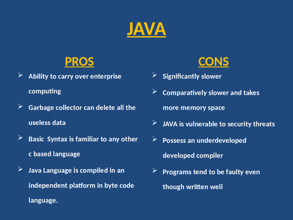 Garbage collector can delete all the useless data Basic Syntax is familiar to any other c based language Java Language is compiled in an independent platform in byte code language. CONS Significantly slower Comparatively slower and takes more memory space JAVA is vulnerable to security threats Possess an underdeveloped developed compiler Programs tend to be faulty even though written well